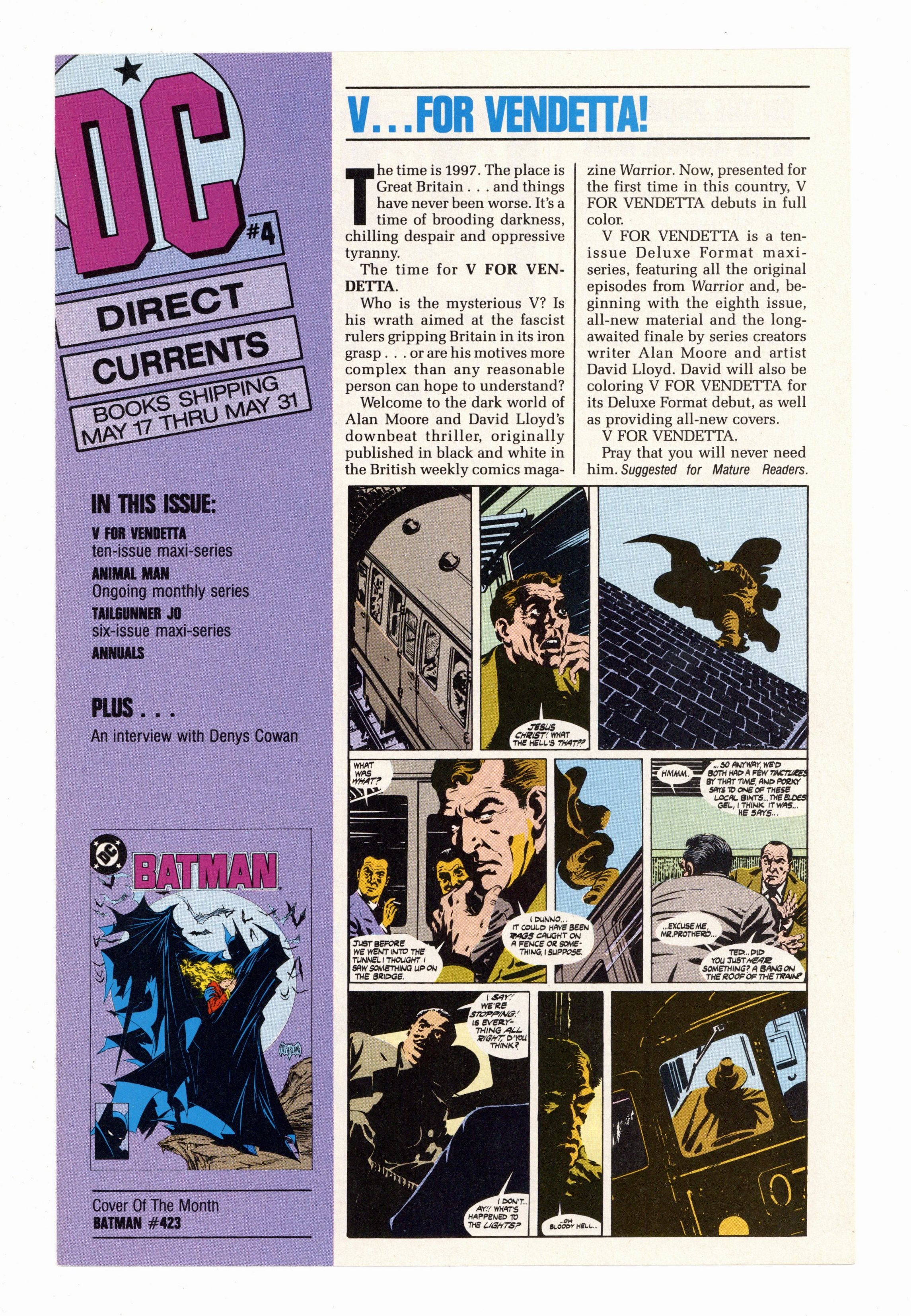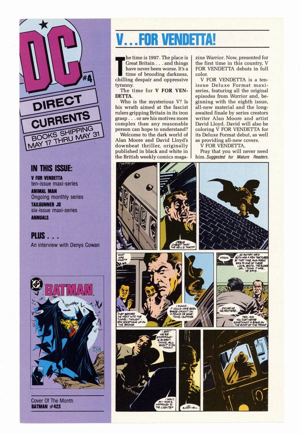 Cover feature: V for Vendetta; other spotlighted releases: Animal Man, Tailgunner Jo; interview with DENYS COWAN; back cover features the cover of Adventures of Superman Annual (1939-1986 1st Series) #1 (the first Annual published)