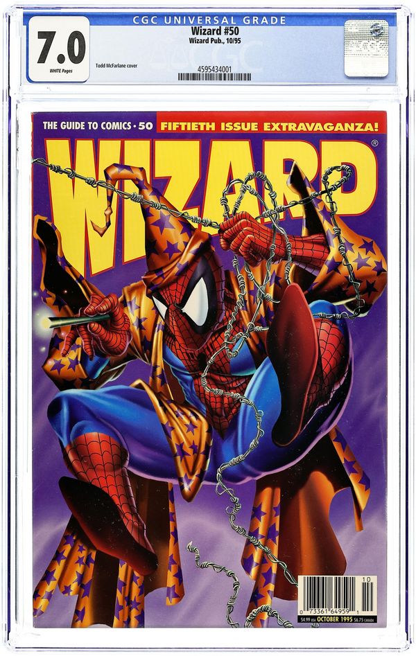 Not polybagged. Spider-Man in wizard outfit cover. Fiftieth issue extravaganza! A day in the life of Todd McFarlane; inside the world of the Tick with Ben Edlund; behind the scenes at Wizard; plus: comic & card price guides, previews. #50P comes polybagged with an X-Files card & a Spider-Man OverPower card. Cover price $4.99.