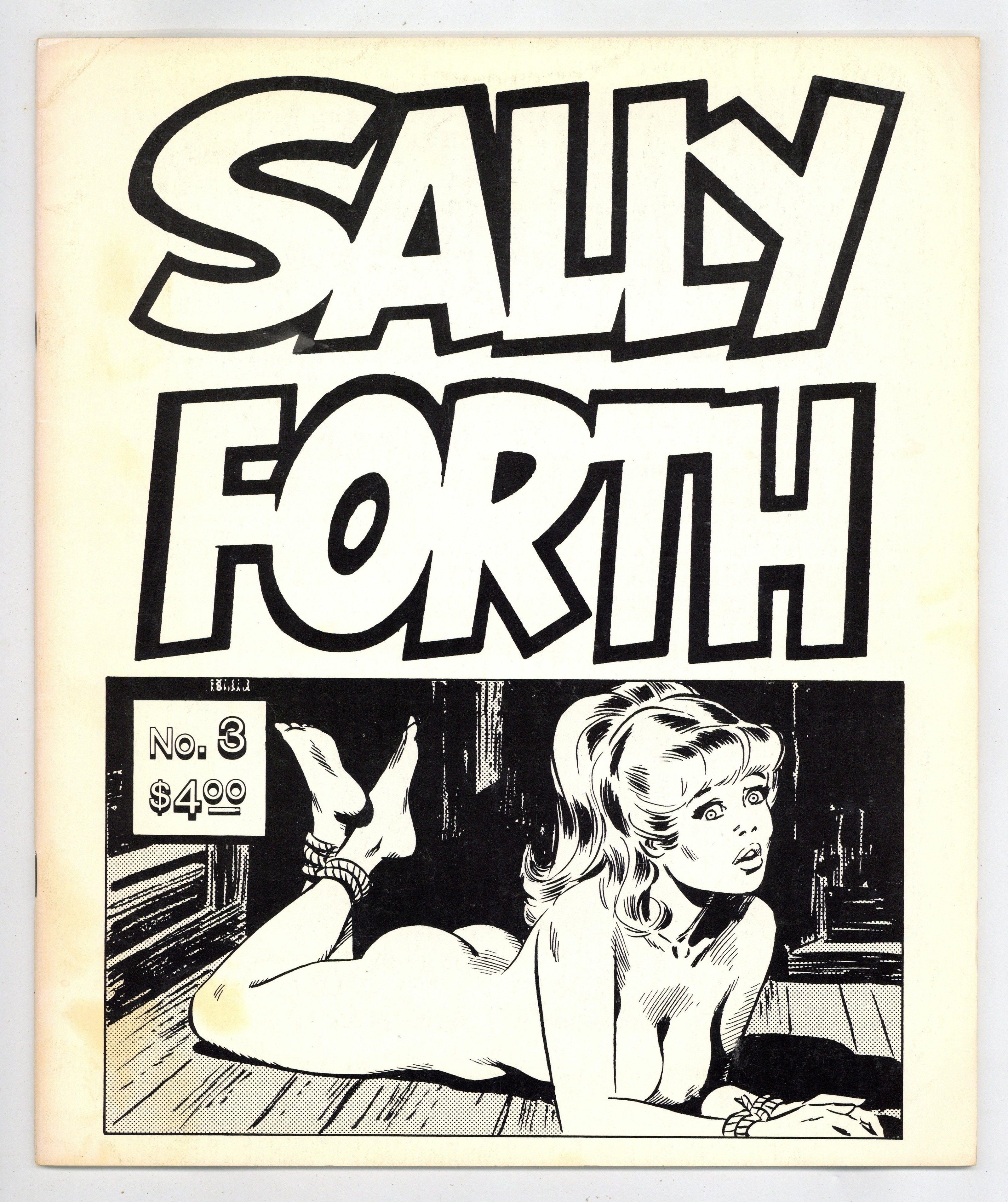 Created for a military male readership, Wood's sexy action-adventure character, who is often seen nude, began as a recruit in a commando outfit. She first appeared in June 1968, in Military News, a 16-page tabloid. Sally returned July 26, 1971, in Overseas Weekly, a tabloid targeted at U.S. military men serving outside North America. With Wood getting an assist from Larry Hama, Sally Forth continued in Overseas Weekly until April 22, 1974. Wood collected the strip in a series of four oversize magazines, of which this is the third. 10-in. x 12-in. staple-bound 32-page soft cover. Mature reader. Cover price $4.00.