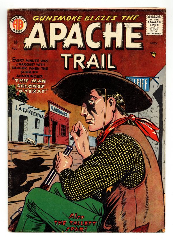 $17.25Yellow, For Gold...and Cowards!, pencils by George Tuska; A Mexican boy helps expose a thief in a mining camp. 100 Toy Soldiers $1.25 ad. Ad for Josely Company's Popeye flashlight and 21" toy diesel truck. The Tallest Spar!; A lumber camp feud endangers the lumberjacks. Boss Lady!; Lil runs the ranch while her brother is away. This Man Belongs to Texas!; An outlaw hides, pretending to be a law-abiding cowboy. 36 pgs. $0.10. Cover price $0.10.