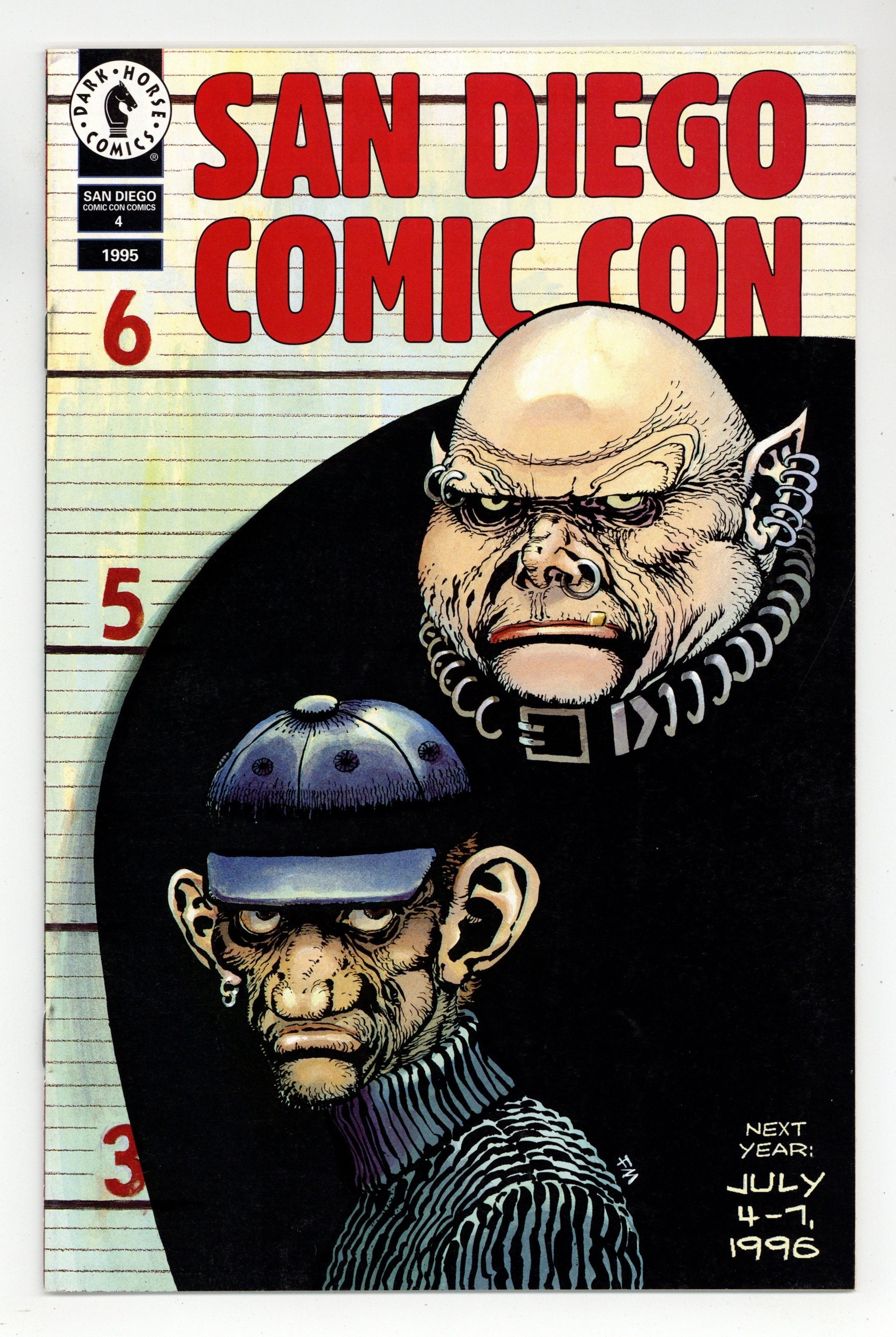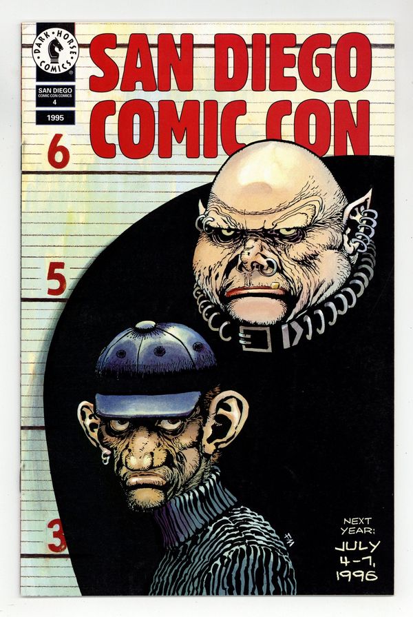 Published 1995 by Dark Horse.$19.50One shot Flip-Book annual. 32 pages. B&W. Rare issues created to help promote the San Diego Comic Con in 1992-1995. Available through the convention and mail order only. "Star Wars an Heir to the Empire" on front cover, art by Killian Plunkett; flip book with "Fat Man and Little Boy", art by Frank Miller. Interior contents: "The Mask in San Diego" story by Eury, Vest, and Janes, pencils by Neil Vokes, inking by Bruce Patterson; "Foot Soldiers" story by Jim Krueger, art by Michael Avon Oeming; "Star Wars: Heir to the Empire" the story is from the novel by Timothy Zahn, adapted to comics by Mike Baron, art by Olivier Vatine and Fred Blanchard; "Madman Pinup" art by Michael Allred; "Tarzan/John Carter: Warlords of Mars" story by Bruce Jones, art by Bret Blevins; "Barb Wire Pinup" pencils by Jim Hall, inking by Tom Simmons; "Cud Comix: Eno and Plum" story and art by Terry Laban; "Motorhead" story by D. G. Chichester, pencils by Karl Waller, inking by Tim Bradstreet; "Tex Avery in Comics: Droopy VS. The Red Baron" story by Robert V. Conte, art by Bill Morrison; "Fat Man and Little Boy" story by Frank Miller. Cover price $2.95.
