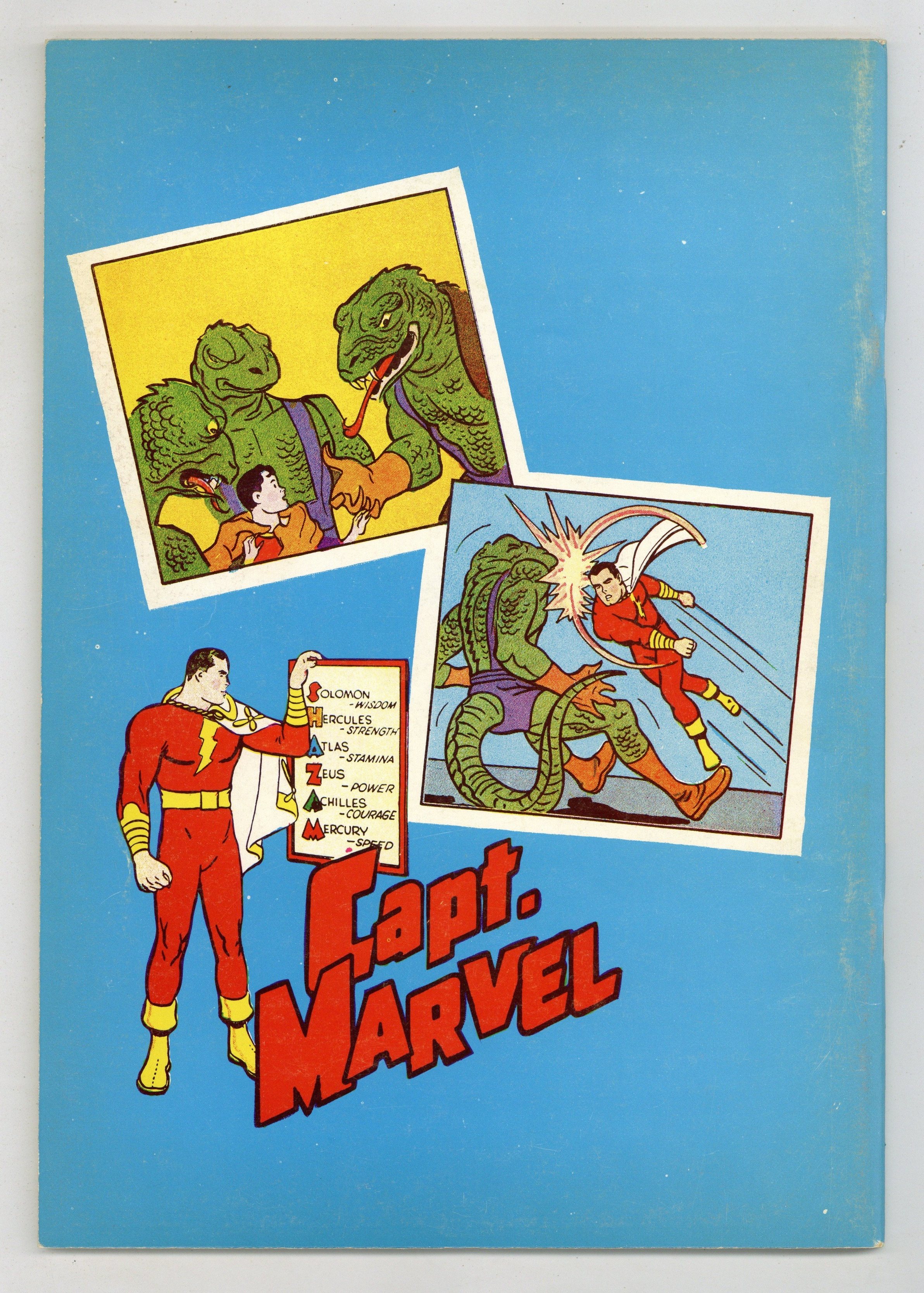 The tenth issue of the Flashback reprint series presents Captain Marvel #1 originally published in 1941 by Fawcett Publications. Cover art by C. C. Beck. "Captain Marvel vs. Z," script by Manly Wade Wellman pencils by Jack Kirby, inks by Dick Briefer; Thwarted time and time again by his avowed enemy, Captain Marvel, Sivana decides to create a rival that is more than human to combat his hated foe...a foe he calls "Z" because he is the ultimate in toughness. "Out West," pencils by Jack Kirby, inks by Dick Briefer; Billy is on vacation at Rimrock and gets involved, as Captain Marvel, in a Broncho riding contest; But Billy spots the owner of the Crossbone Ranch and feels he knows him, and begins an investigation that leads him directly to the owner as the leader of a large rustling operation while he poses as a victim himself of the band of rustlers. Captain Marvel Pencil-Puzzle-Page. "The Monsters of Saturn," pencils by Jack Kirby, inks by Dick Briefer; Billy receives a message from Saturn over his radio device from captives that are being enslaved by monsters on the planet, asking for assistance; Captain Marvel travels by rocket ship to Saturn to take on the vicious slave drivers, allowing himself to be captured by his foes in order to get the full story about the enemy before he deals with them and prevent an invasion of the Earth. "Battles the Vampire," pencils by Jack Kirby, inks by Dick Briefer; Billy is given an assignment to interview a Doctor Deever, who has created a process to restore the dead to life; The doctor takes Billy to a cemetery and succeeds in raising a vampire back to life; Billy, checks out a book to aid him in his cause: "The Vampire Legend" by H. P. Lovecraft. Back cover Captain Marvel illustration by Jack Kirby. 68-pages, full color cardstock covers, 7-3/4-in. x 10-3/8-in. black-and-white interior on white paper stock, saddle-stitched binding. Cover price $3.00.