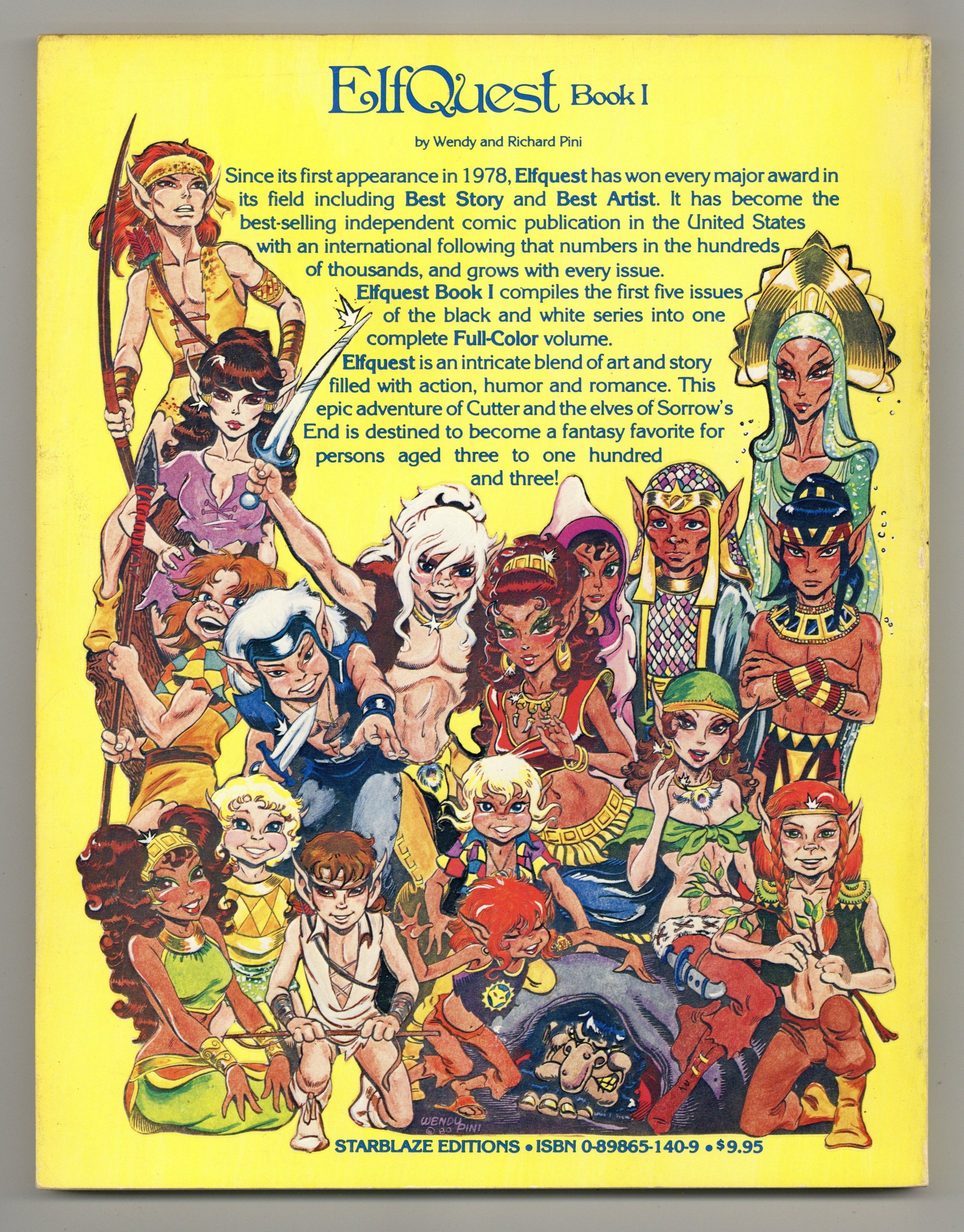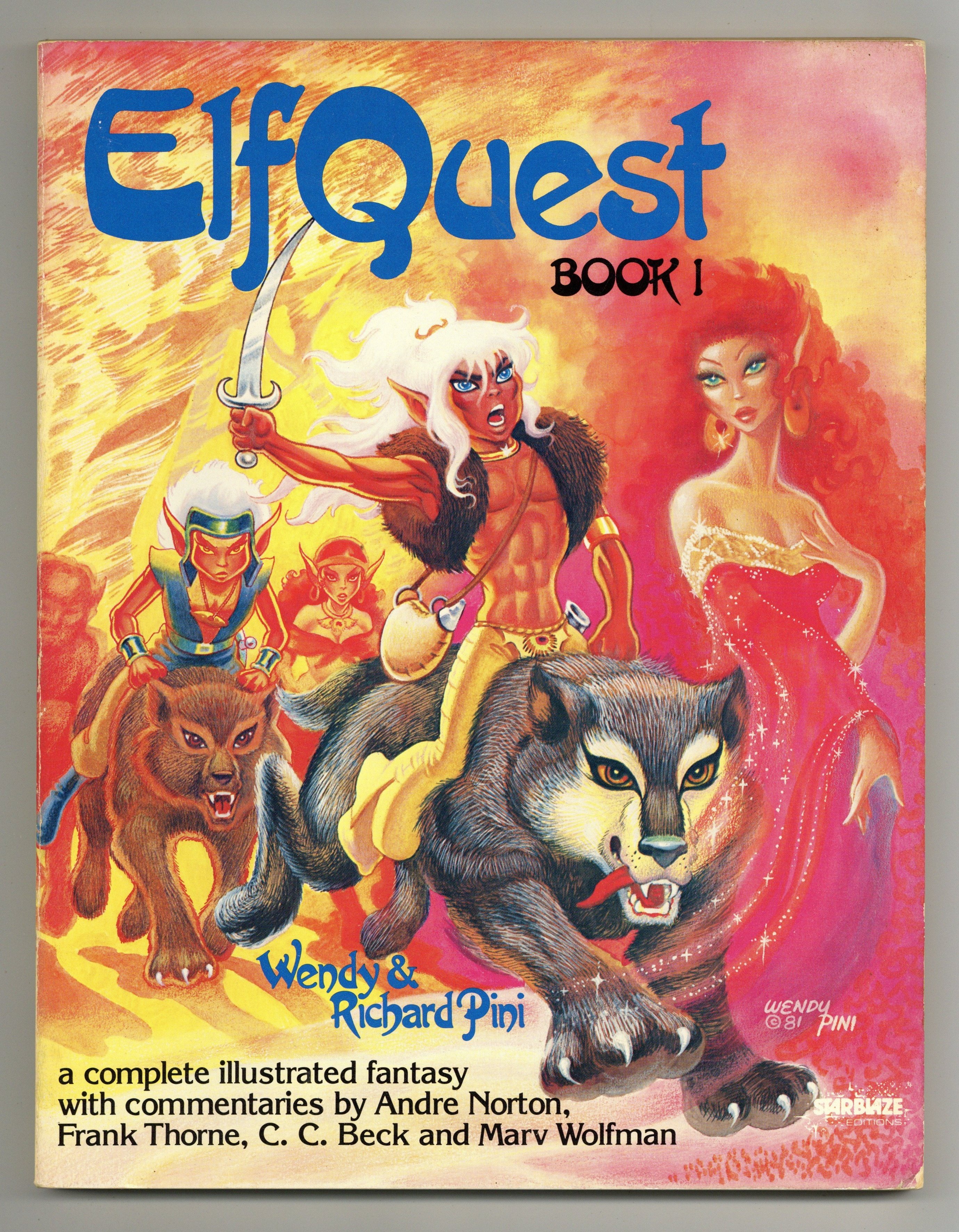 Volume 1 - 1st printing. Written by Wendy and Richard Pini. Art and cover by Wendy Pini. The Elfquest saga is a complete fantasy epic by Wendy and Richard Pini. With commentaries by Andre Norton, Frank Thorne, C.C. Beck and Marv Wolfman. Softcover, 8-1/2-in. x 11-in., 154 pages, full color. Cover price $9.95.