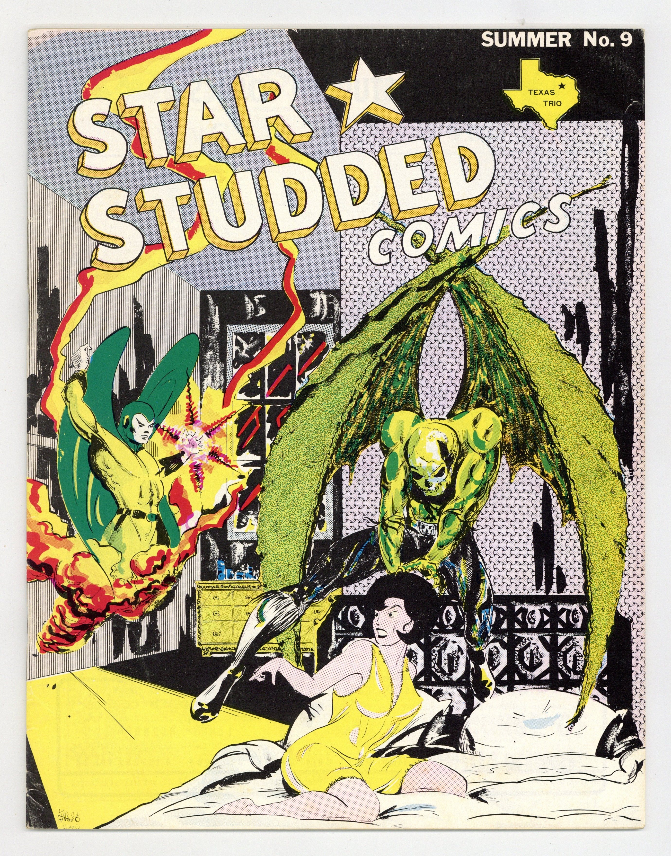 Published Jun 1966 by Texas Trio.$37.00Star-Studded Comics 9 - Summer 1966 Format: Photo offset printing Wrap-around binding with staples in center. Original price was 50 cents Color cover by Buddy Saunders features Doctor Weird. Back cover by D. Bruce Berry for Vale Proditor! "Let's Talk It Over!" notes print run of this issue was 500 copies. "From Our Readers" features letters from Dennis Richard, John Melvin, Landon Chesney, John Wright, George R.R. Martin, Dave Bibby, and William C. Lee. Full page ad for audio tapes of a Captain Marvel serial, the Superman Broadway play, and the Mad Magazine Broadway play. Stories:Dr. Weird in "The Curse of Skullwing!" Comic story with script by Larry Herndon and art by Alan Weiss Powerman versus "The Transmuter" Comic story with script by Dave Bibby and art by Bill Dubay Vale Proditor! Text story by Howard Waldrop and illustrations by Buddy Saunders. Today Waldrop is a noted science fiction writer. This was possibly his first published story. Xal-Kor the Human Cat in "A Friend in Need!" Comic story with script and art by Richard "Grass" Green Cover price $0.50.