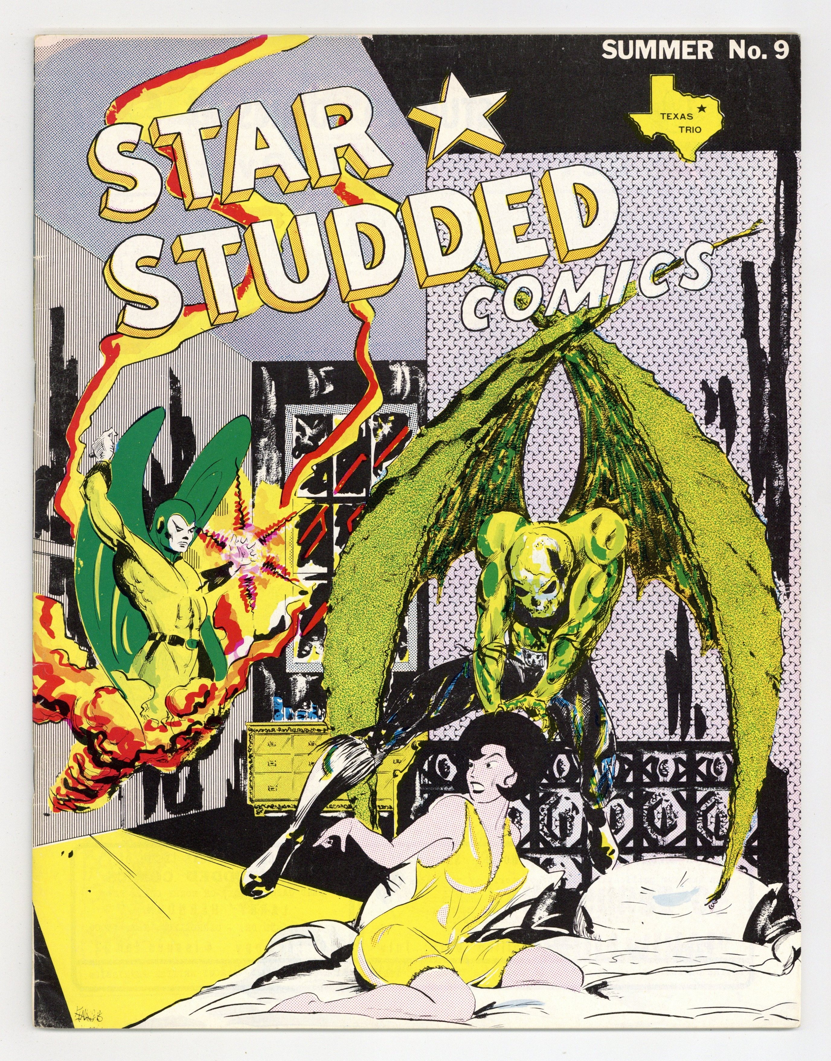 Published Jun 1966 by Texas Trio.$23.00Star-Studded Comics 9 - Summer 1966 Format: Photo offset printing Wrap-around binding with staples in center. Original price was 50 cents Color cover by Buddy Saunders features Doctor Weird. Back cover by D. Bruce Berry for Vale Proditor! "Let's Talk It Over!" notes print run of this issue was 500 copies. "From Our Readers" features letters from Dennis Richard, John Melvin, Landon Chesney, John Wright, George R.R. Martin, Dave Bibby, and William C. Lee. Full page ad for audio tapes of a Captain Marvel serial, the Superman Broadway play, and the Mad Magazine Broadway play. Stories:Dr. Weird in "The Curse of Skullwing!" Comic story with script by Larry Herndon and art by Alan Weiss Powerman versus "The Transmuter" Comic story with script by Dave Bibby and art by Bill Dubay Vale Proditor! Text story by Howard Waldrop and illustrations by Buddy Saunders. Today Waldrop is a noted science fiction writer. This was possibly his first published story. Xal-Kor the Human Cat in "A Friend in Need!" Comic story with script and art by Richard "Grass" Green Cover price $0.50.