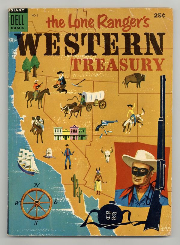 "The Western Stock Saddle"; Drawings and descriptions of various saddles. "The Silver Bullet," art by Tom Gill; The Lone Ranger and Tonto track a band of rustlers; The secret of the Lone Ranger's silver bullets is revealed. "The Lone Ranger's Peacemakers"; Short article about the Colt .45 revolver. "Cowboy Clothes"; Drawings and descriptions of cowboy work clothes and items. "The Mission of Mercy," art by Tom Gill; The Lone Ranger and Tonto ride guard on a shipment of smallpox serum intended for the Sioux Indians. "Lost Treasures of the West"; Short articles about lost mines and lost riches in the Old West. "The Great Range War," art by Tom Gill; The Lone Ranger and Tonto help settle a dispute among cattlemen, sheepmen and farmers. "Cowboy Words"; A glossary of cowboy terms. "Brands and Branding"; An explanation of the way cowboys brand and mark cattle. "Indian Scout," art by Tom Gill; When a wagon train's scout is killed, Tonto guides the wagon train through the desert and helps them ward off attacks from the Sioux and the Cheyenne Indians. "The Western Scout"; Survival skills used by a western scout. "Ransom for Silver," art by Tom Gill; An Indian chief holds Silver hostage to force the Lone Ranger to arrange peace between two warring tribes. "The Anatomy of the Horse"; Diagram of the horse and its parts. "The Eagle's Nest," art by Tom Gill; Silver encounters a nest of eagles and helps save a herd of horses from a wildfire. "Famous Cattle Trails of the Old West"; A map of the trails used in the cattle drives in the late 1800's. 100 pgs., full color. Cover price $0.25.