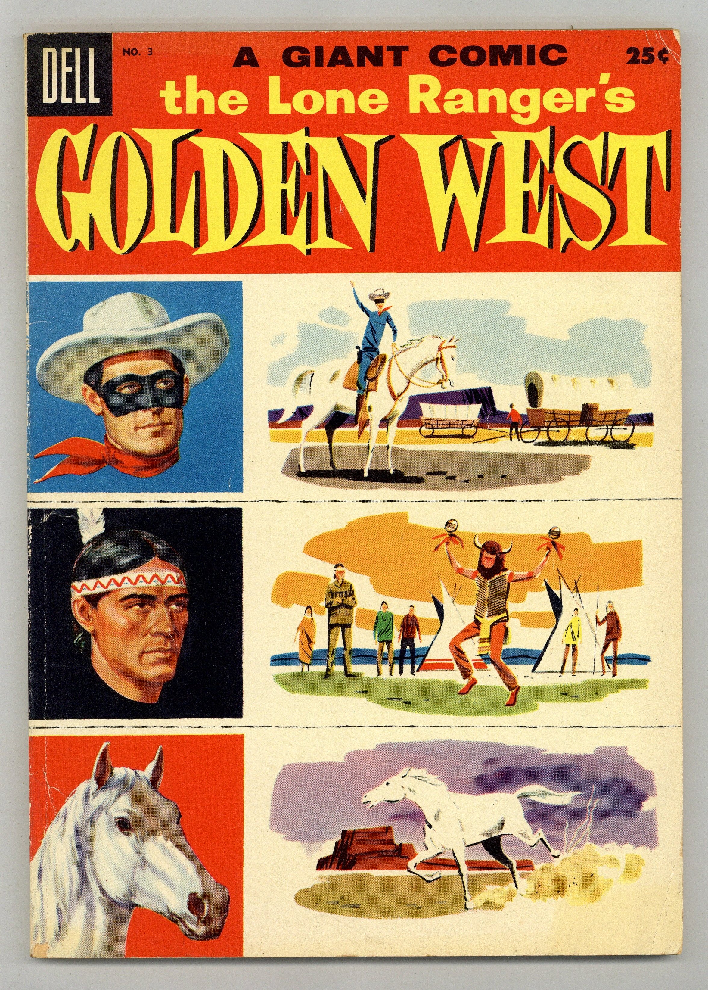 Tags: Dell Giant$35.00The Lone Ranger stars in "He Finds Dan Reid," "A Message in Time," "Flight Through the Wastelands," "Bad Medicine," "The Call of Wild Horse Valley," and "Danger at Beaver Pond." 100 Pages, Full Color. Cover price $0.25.