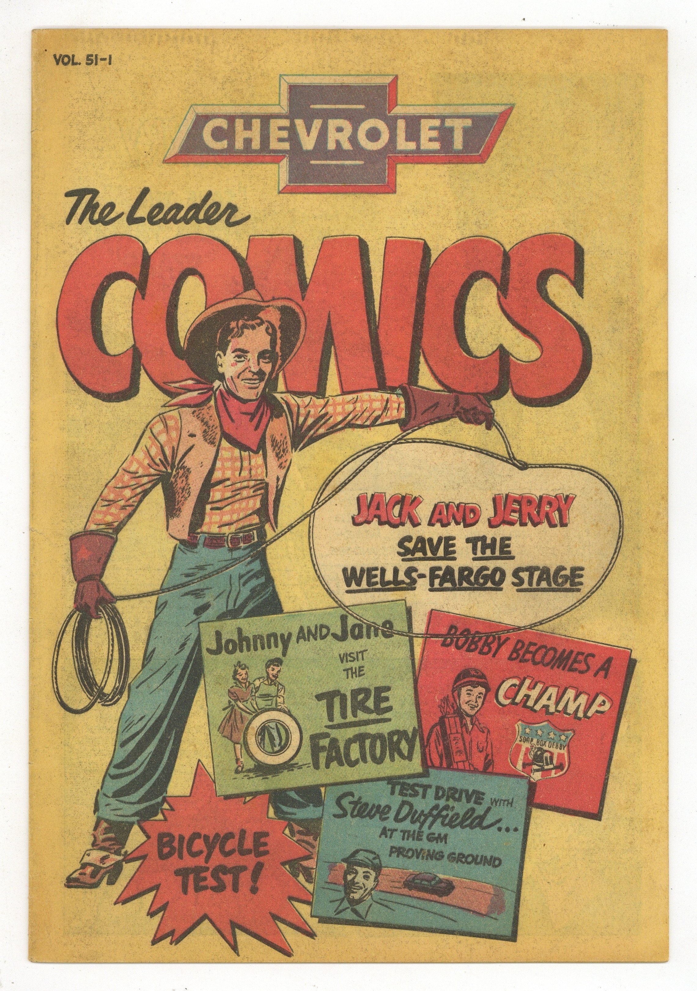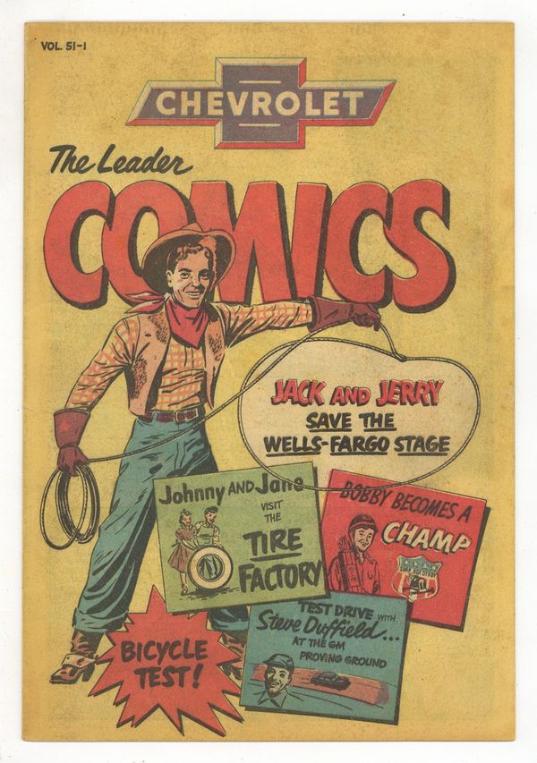 $81.00Promotional comic released in 1951 by Chevrolet (Vol. 51-1). Standard comic size, 16-pages including covers, all color, all newsprint, with no cover price. "Johnny and Jane Vist the Tire Factory" and see how tires are made. --- "Bobby Becomes a Champ" in the pinebox derby. --- and "Test Drive with Steve Duffield at the GM Proving Grounds."