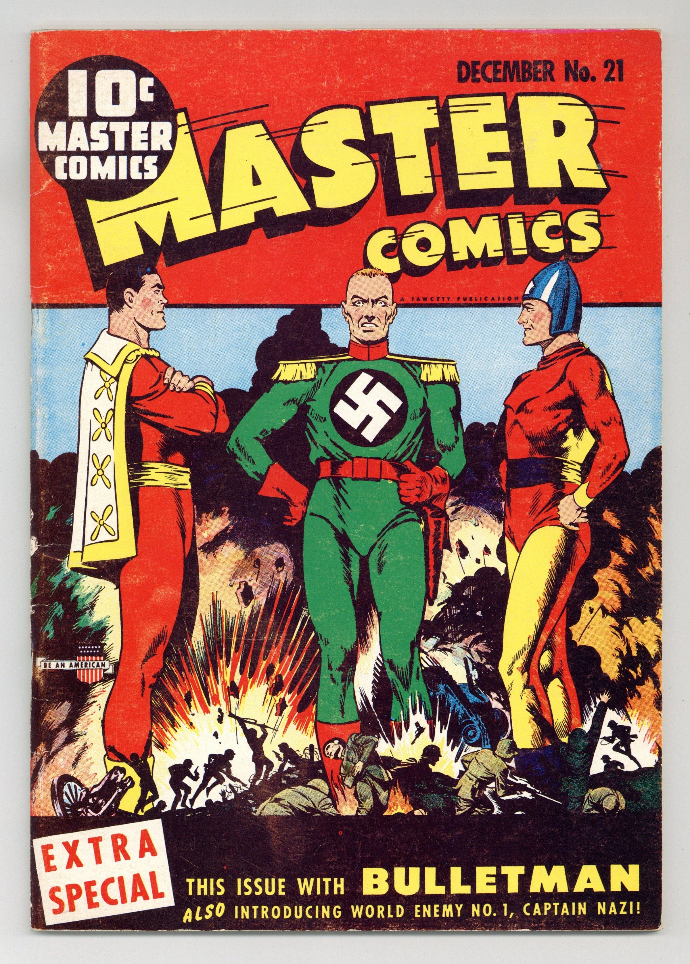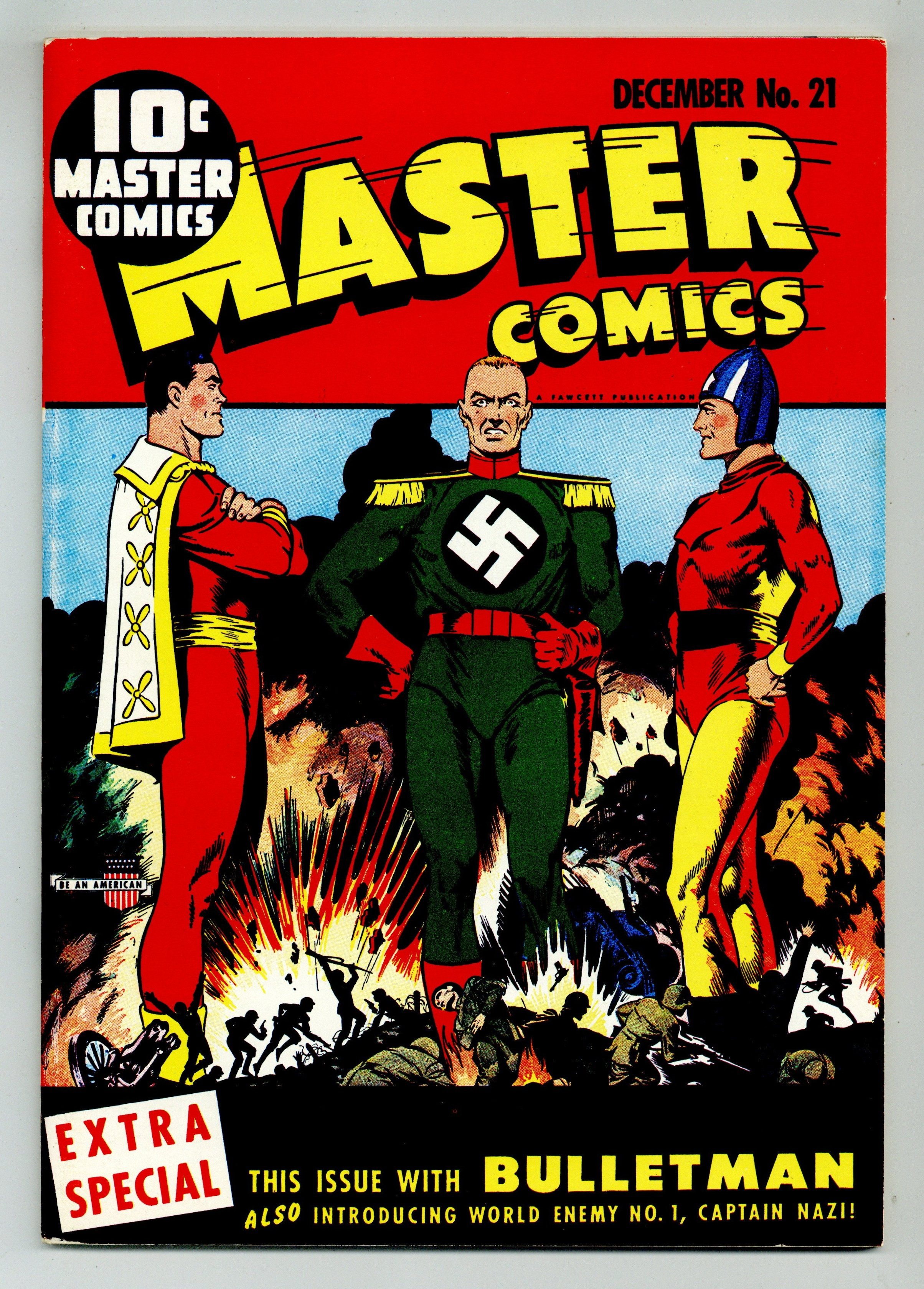 The 18th issue of the Flashback reprint series presents MASTER COMICS #21 originally published in 1941 by Fawcett Publications. Cover art by Mac Raboy. Captain Marvel Picture Puzzle ad. "The Coming of Captain Nazi," script by Bill Woolfolk, art by Mac Raboy; Origin and first appearance of Captain Nazi, who will cause the creation of Capt. Marvel Jr. in Whiz 25. Captain Marvel Club ad. "The Black Dragon Society!", art by Charles Sultan; Minute Man vs. Black Dragon Society. "V Stands for Victory" text story by Manly Wade Wellman (as Juan Lopez). "The Curse of the Balandrachu" starring El Carim, art by George Tuska. "The Goat People and the Dragon" starring Captain Venture and the Planet Princess, script by Otto Binder, art by Rafael Astarita; vs. King Leon. "The Peacemakers" starring the Companions Three. "The Landers-Benson Range War," art by Ralph Carlson; Buck Jones and Mike run smack into a range war, and have to make peace. "Black Giant, the Man from the Grave" starring Zoro The Mystery Man 68-pages, full color cardstock covers, 7-3/4-in. x 10-3/8-in. black-and-white interior on white paper stock, saddle-stitched binding. Cover price $3.00.
