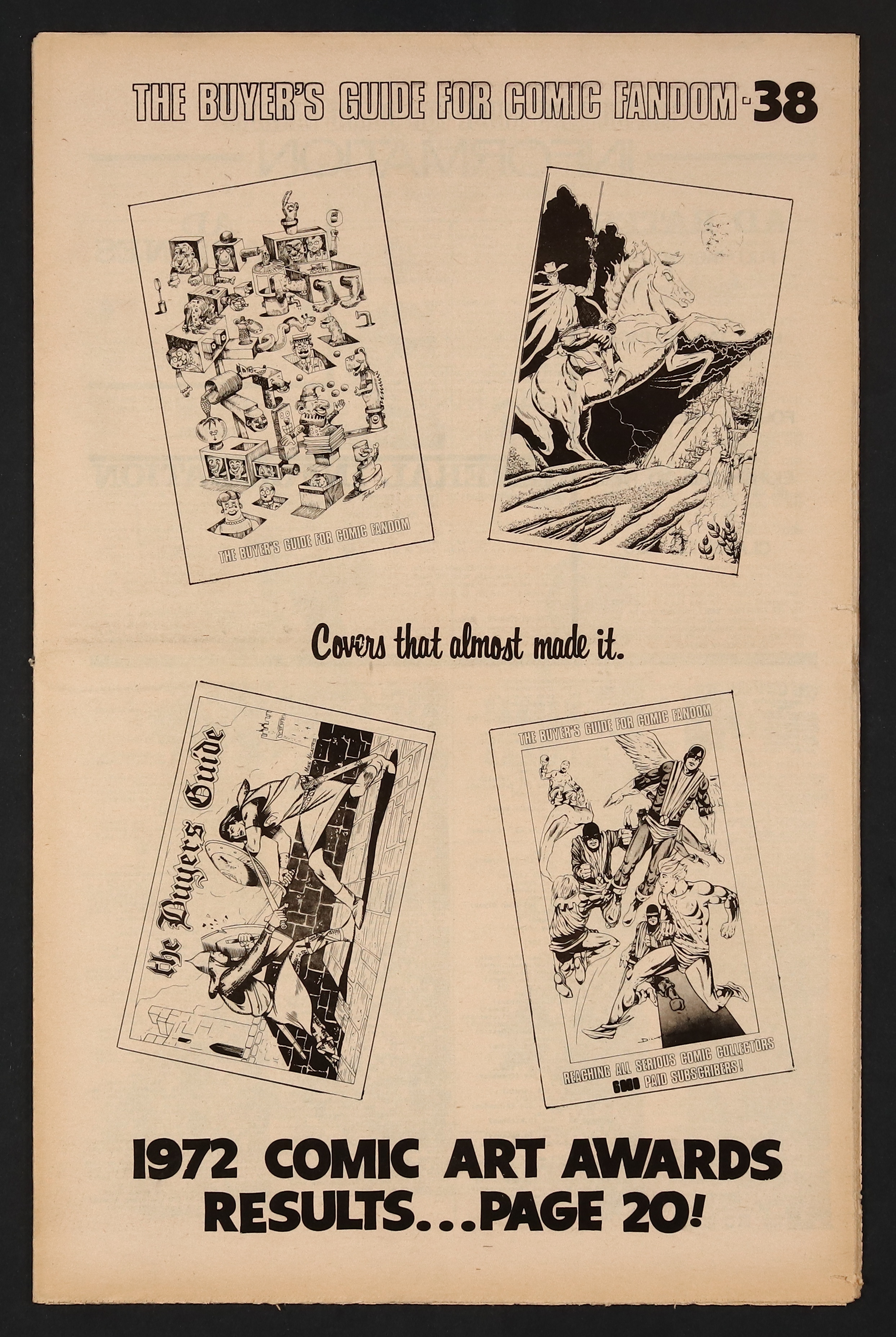 The Buyers Guide for Comic Fandom #38, June 15, 1973. This issue consists of two sections and 40 pages, and features a Beautiful Balloons column by Don and Maggie Thompson; and a Now What column by Murray Bishoff. There is no cover date on this issue. The contradictory Covers That Almost Made It cover consists of four rejected covers drawn by four different artists: John Cody, Bob Conway, Mike Nicastre, and Dick Kulpa. It was the only time Nicastres work appeared on the cover of an issue of TBG, but the other three eventually cracked the solo cover barrier later on. Four years later, publisher Alan Light resurrected this feature idea in TBG 227 and 233. However, he relegated it to the inside. Summary of this issue by Russ Maheras.