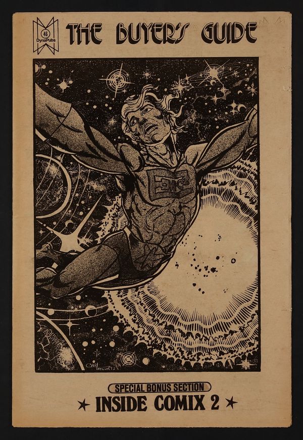 $23.00The Buyers Guide for Comic Fandom #46, Oct. 15, 1973. NOTE: There is an issue number on the cover, but no cover date. This issue consists of two sections and 48 pages, and features a Now What column by Murray Bishoff; a Beautiful Balloons column by Don and Maggie Thompson; and the final excerpts from the Inside Comix #1 preview first featured in TBG #39. The E-Man cover is by Carl Taylor, his first and only cover among TBGs first 400 issues. Summary of this issue by Russ Maheras.