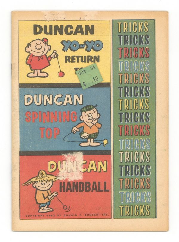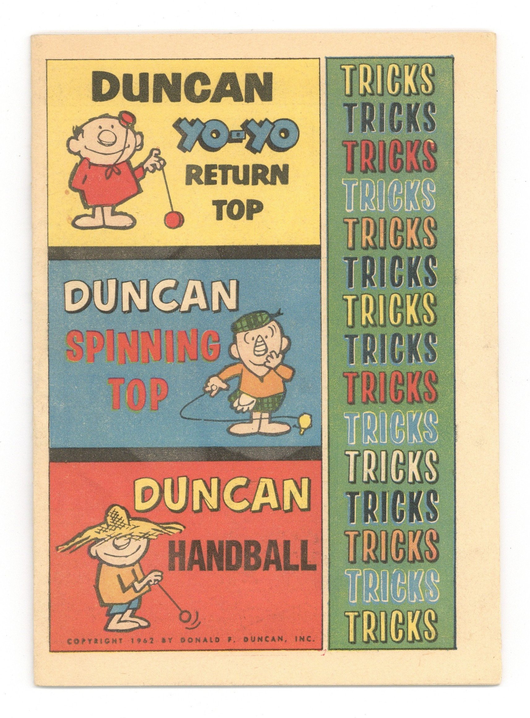 Published 1961 by Duncan Yo-Yo.$41.00Printed on heavier-than-usual paper, March of Comic-sized, full color. Page after page depicting the character on front cover as he demonstrates various yo-yo tricks. 25c cover price. Cover price $0.25.