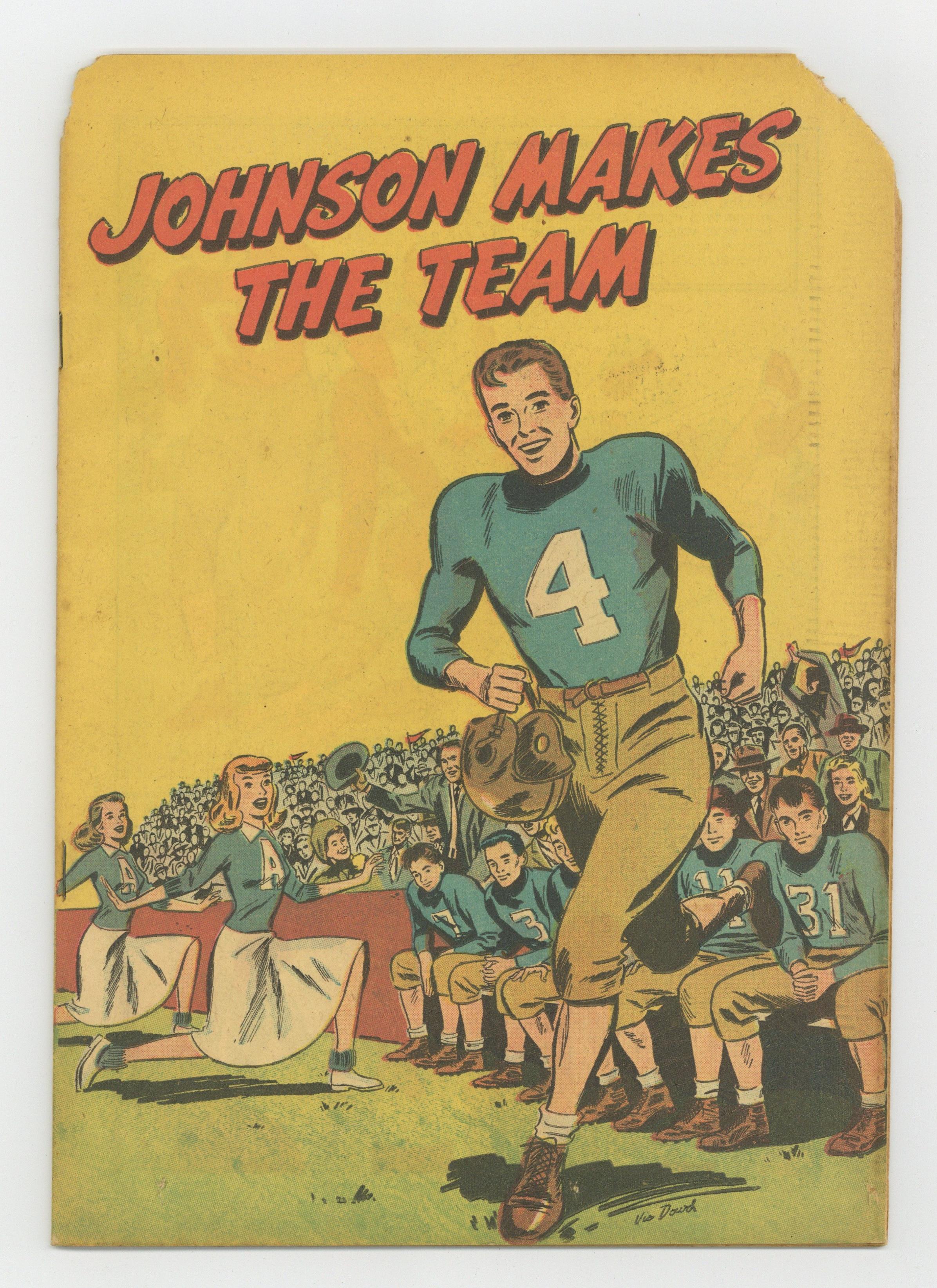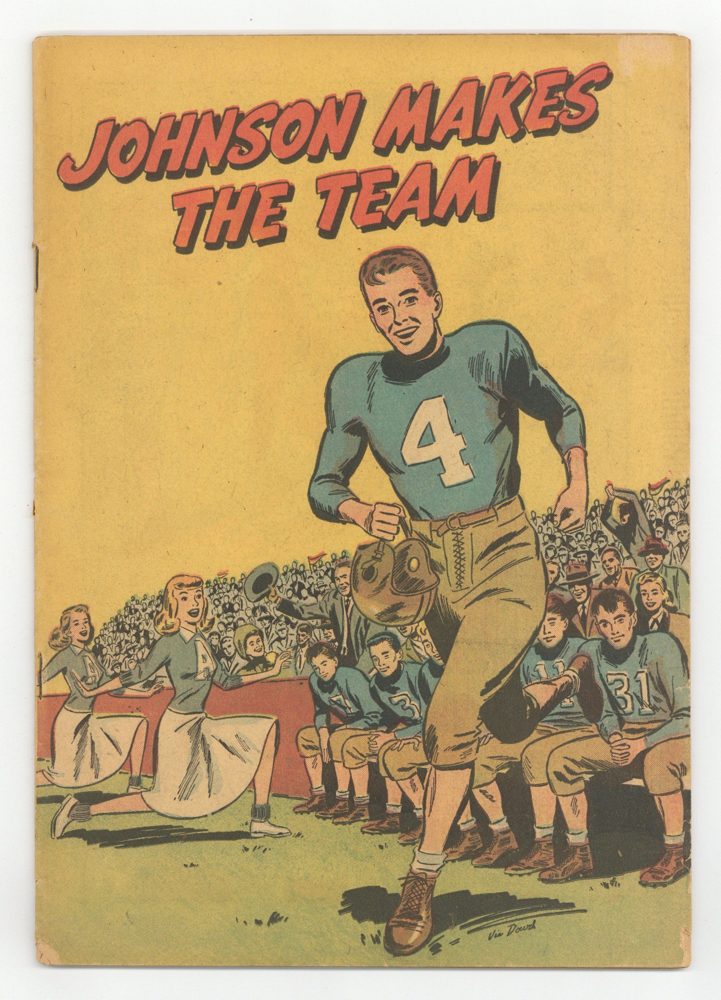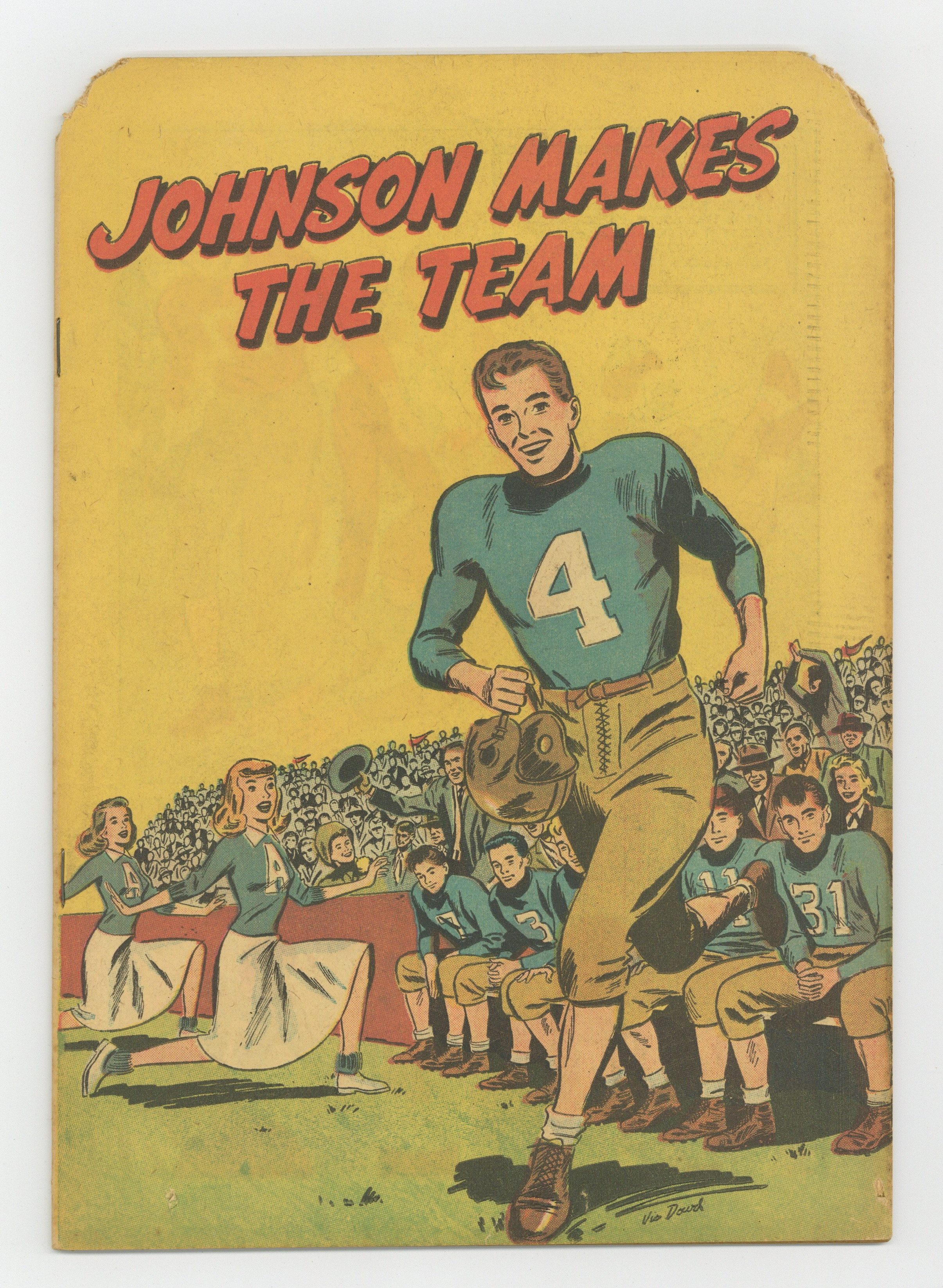 Johnson Makes the Team (1950) was published by the B. F. Goodrich Co. not long after World War II ended. It tells how rubber has played a key role in American progress both in times of war and peace. Full color, 32-pages, 7-in. x 10-in., all newsprint, no cover price, no publication date or copyright date. Publication date of 1950 is an estimate based on clothing styles and other clues in the artwork.