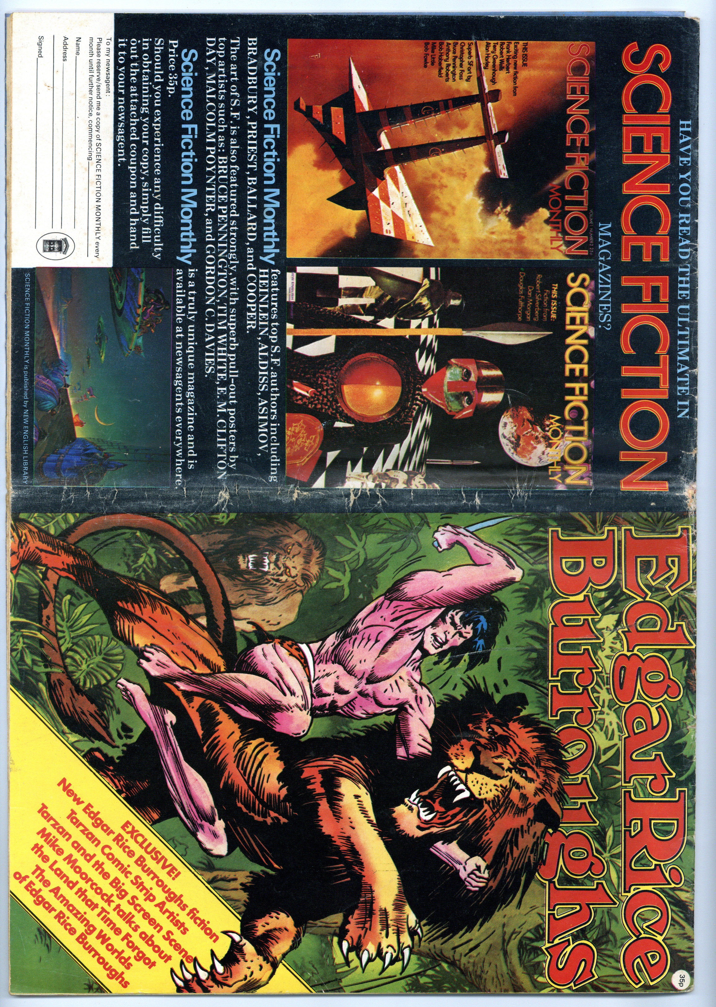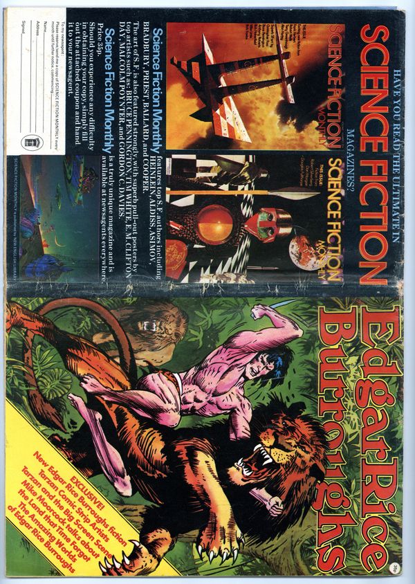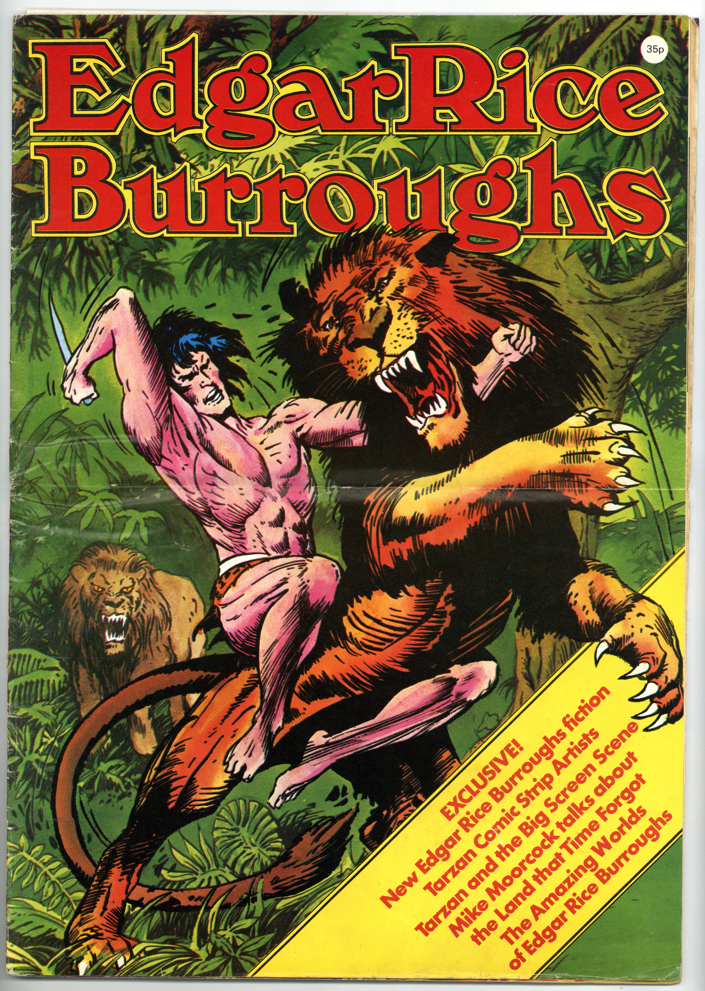 Published 1975 by New English Library.$30.00Copy is complete with all posters and pages. Edgar Rice Burroughs (35p) was published in London by New English Library in 1975. 32-page poster and articles format, 11-in. x 16-in., Color covers, color and black-and-white interior, unbound (not stapled). All copies will have a mid-point fold because this item was originall displayed and sold folded to standard 8-in. x 11-in. magazine size. Features: 1) The Life of Edgar Rice Burroughs; 2) Tarzan of the Comic Strips; 3) Tarzan Miscellania; 4) The Amazing Worlds of ERB; 5) Burroughs Quiz; 6) Pellucidar Crossword; 7) List of Motion Picture and TV Adaptations; 8) Michael Moorcock Talks About The Land that Time Forgot; 9) The Wild West of ERB; 10) Tarzan and the Big Screen Scene; 11) The SF Comic Strips of ERB; 12) Fantastic Visions (posters you can put on your wall); 13) ERB--An Autobiographical Sketch; and 14) The Fanatics, an Interview with Frank Westwood.