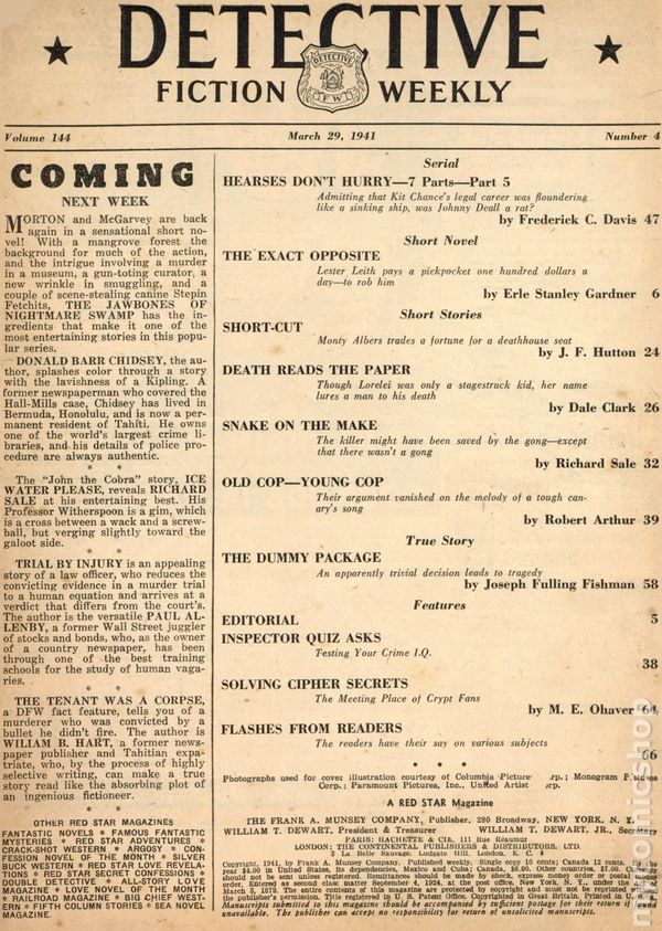 "The talking clocks" 2/6 serial by Frank Gruber-2/6, plus "Easy to Kill" a novelette by Hugh B. Cave, and "Herbie Rides His Hunch" a novelette by Frederick Brown-n.