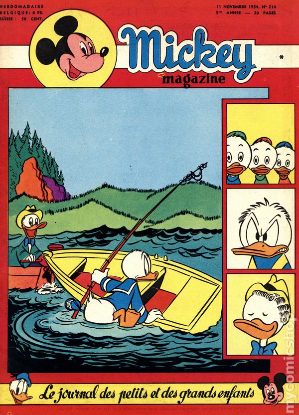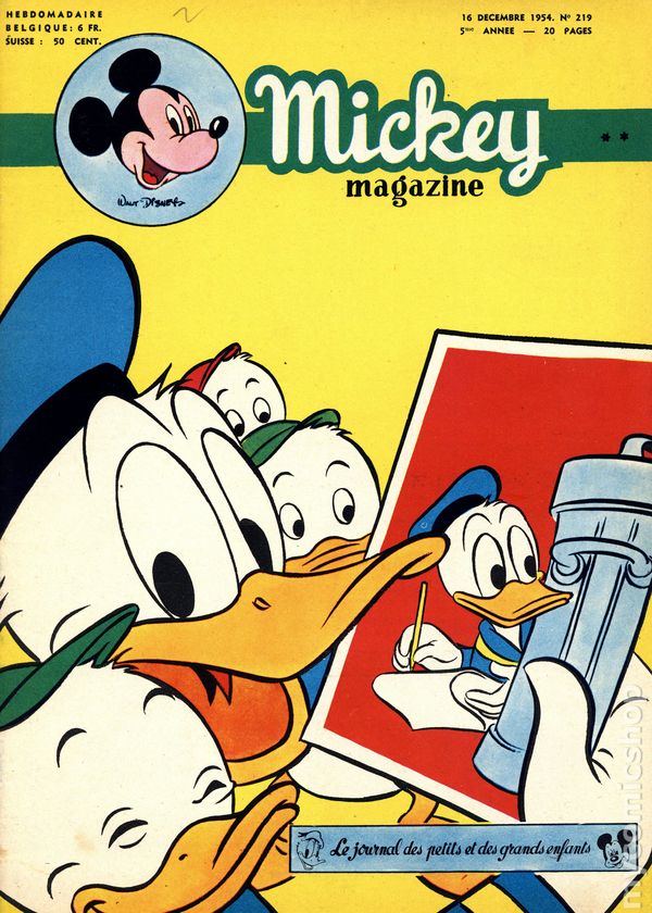 Published from 1950-1959, this Belgian publication reprinted various Disney comics and strips in a magazine-sized format with half the pages in color and half in black and white on newsprint pages. Each issue had 20 pages. In addition to comic stories, issues featured puzzles, editorials, and letters columns. The stories, including ones by Carl Barks, were serialized and often printed one page per issue, but each issue ended with one complete story. As a result, many stories were resized to five or six lines per page. French Language