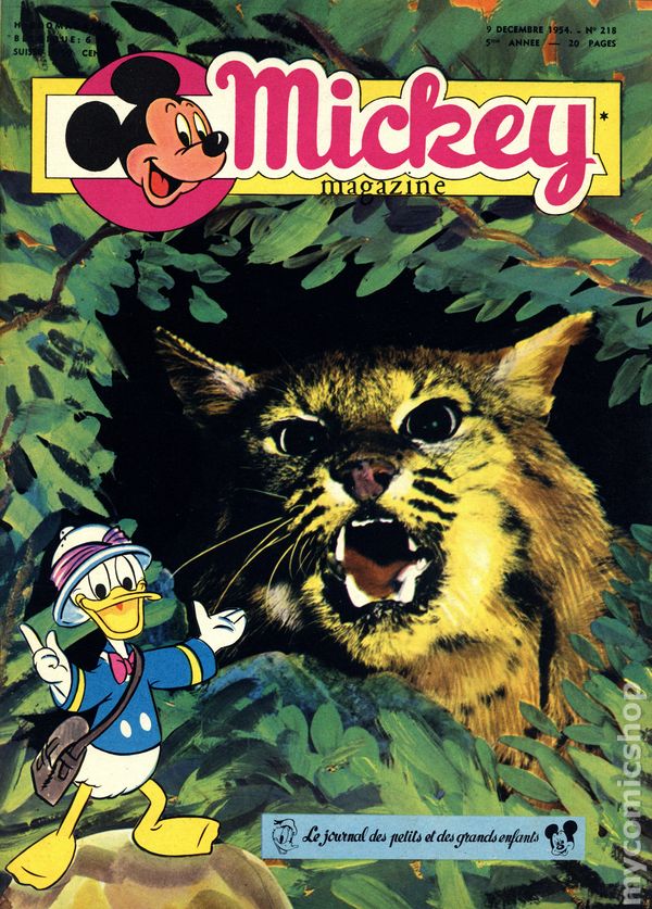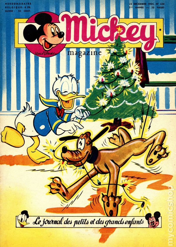 Published from 1950-1959, this Belgian publication reprinted various Disney comics and strips in a magazine-sized format with half the pages in color and half in black and white on newsprint pages. Each issue had 20 pages. In addition to comic stories, issues featured puzzles, editorials, and letters columns. The stories, including ones by Carl Barks, were serialized and often printed one page per issue, but each issue ended with one complete story. As a result, many stories were resized to five or six lines per page. French Language.