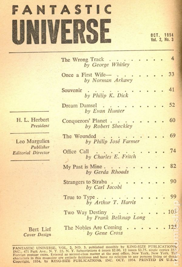 Oct 1954. Cover by Bart Lief. Science fiction stories by Philip K. Dick "Souvenir", Frank Belknap Long, Philip Jose Farmer, Robert Sheckley, Evan Hunter, George Whitley, Norman Arkawy, Charles E. Fritch, Gerda Rhoads, Carl Jacobi, Arthur T. Harris, and Gene Cross. No interior illustrations. 5.25-in. x 7.5-in.; black and white; 128 newsprint pages. Cover price $0.35.