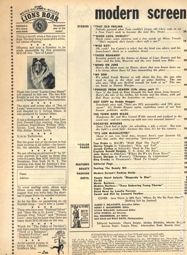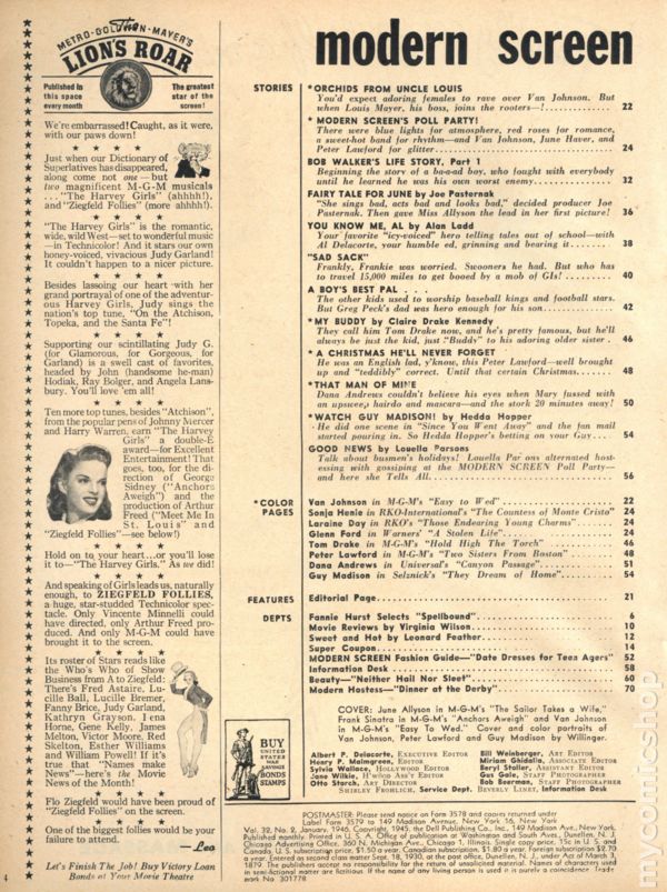 Vol. 36, No. 2. January 1948. June Allyson cover. Vintage celebrity gossip tabloid with a focus on Hollywood during the golden-age of cinema. 8.5" x 11.5", 96 pages, B&W and Color. Cover price $0.15.