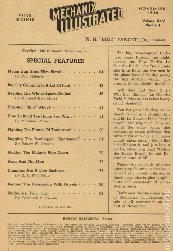 View scansVolume 25, Issue 2 - December, 1940. Mechanical science and technology magazine. This issue's articles include; "Bowling Tips From Champions" by Neil C. King, "Riding the Radio Beam" by John L. Scherer, "There's Real Money in a Model Railroad!" by R. DeWitt Miller, "Stock Car Rides Race With Death!" by John R. Whiting, "He Unlocked the Door to Success" by Bob Ruskauff, "Coming - The Frameless Automobile" by Israel Klein, and others. 6 1/2-in. x 9 1/2-in., 146 pages, BW/spot color. Cover price $0.10.
