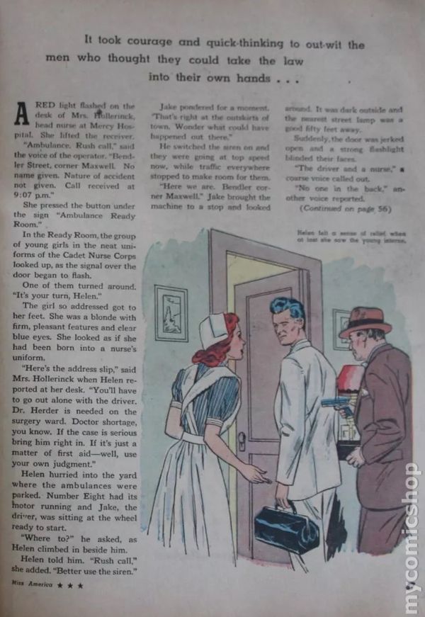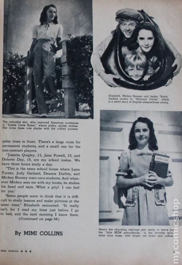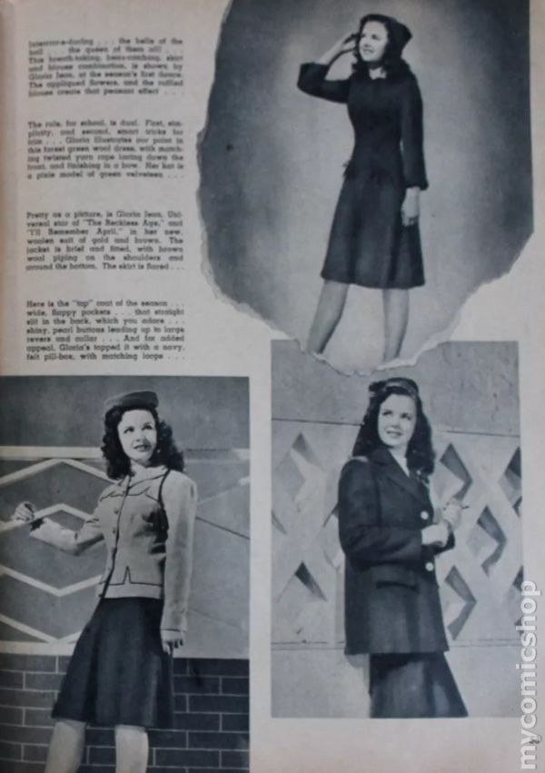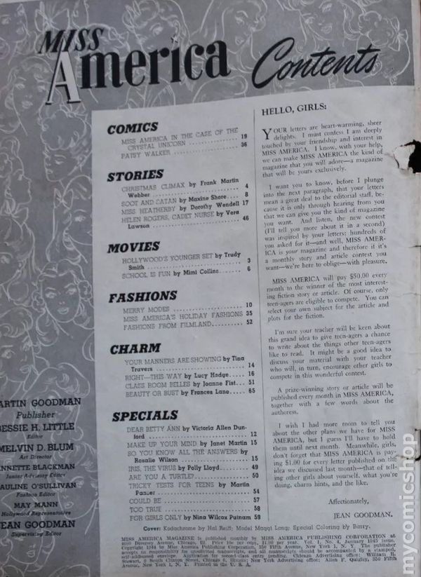 Millie Long photo cover. Contains two comics in full color: Miss America in the "Case of the Crystal Unicorn" 14 pg and Patsy Walker 7pg. Art for both of the comics are by Pauline Loth. Also contains four text stories by Frank Martin Webber, Maxine Shore, Dorothy Wendell, & Patricia Wendell with illustrations by Louise Alton & Peter Driben. Fashion, movies, 66 pg, BW,PC. Cover price $0.10.