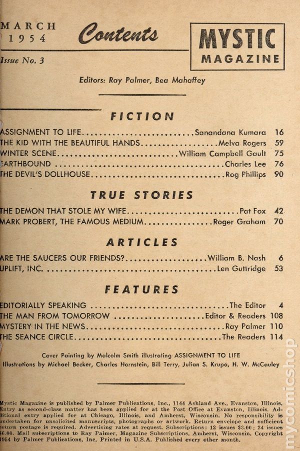 View scansIssue 1 - November, 1953. Occult and science fiction magazine, featuring non-fiction articles and essays. 5" x 7.5", 132 pages, B&W. Cover price $0.35.