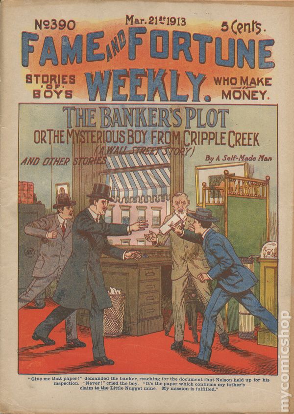 March 21, 1913. The Banker's Plot; or, The Mysterious Boy from Cripples Creek. 11" x 8", 36 pages. Cover price $0.05.