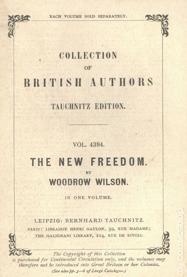 The New Freedom by Woodrow Wilson. Tauchnitz published English language literature for distribution on the European continent outside Great Britain. 4.5" x 6.5", 278 pages, text.