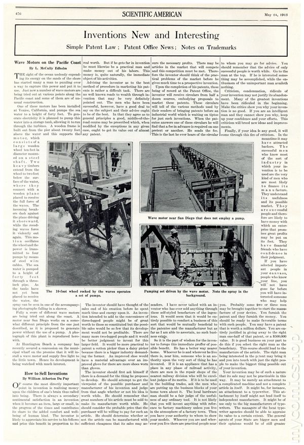 Vol. 108, No. 18 - May 3, 1913. Magazine of popular science. 10.75" x 15.5", 38 pages, B&W Cover price $0.15.