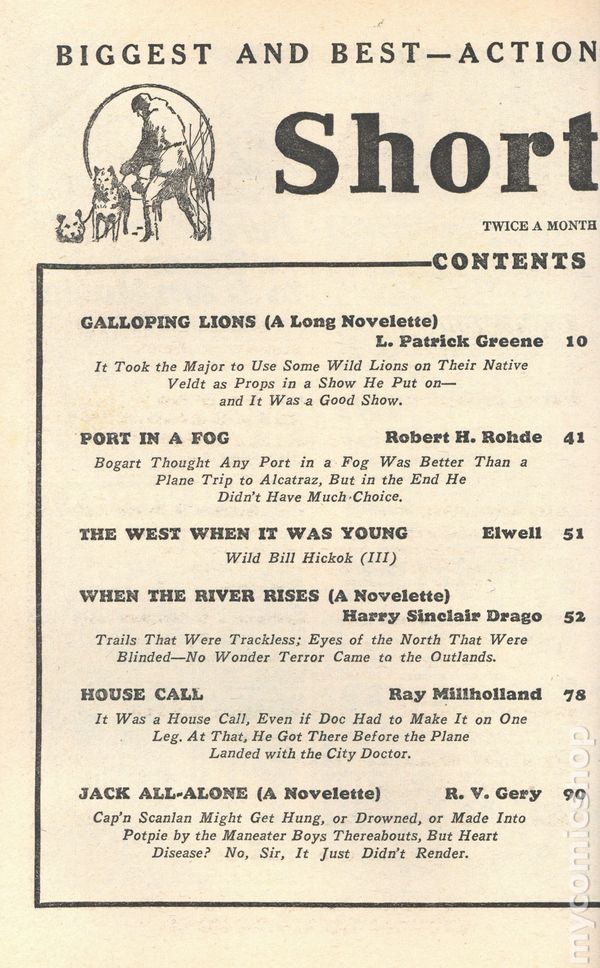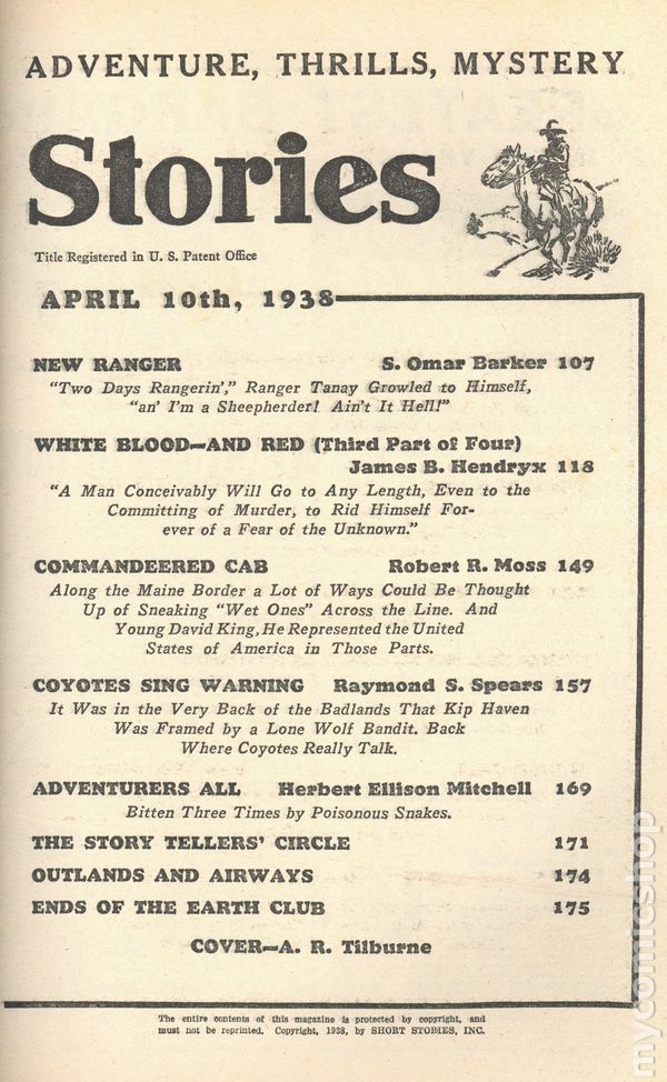 Volume 66, Issue 6 - April, 1938. Cover by Herbert Morton Stoops. Fiction by William Chester ("Kioga of the Unknown Land" part 2), William Makin, H. Bedford-Jones, Fulton Grant, Gordon Keyne, Capt. L.B. Williams, Robert R. Mill, William MacLeod Raine, and Carl M. Chapin. Illustrations by Austin Briggs (5) and others. 6.5-in. x 10-in.; black and white; 144 newsprint pages. Cover price $0.15.