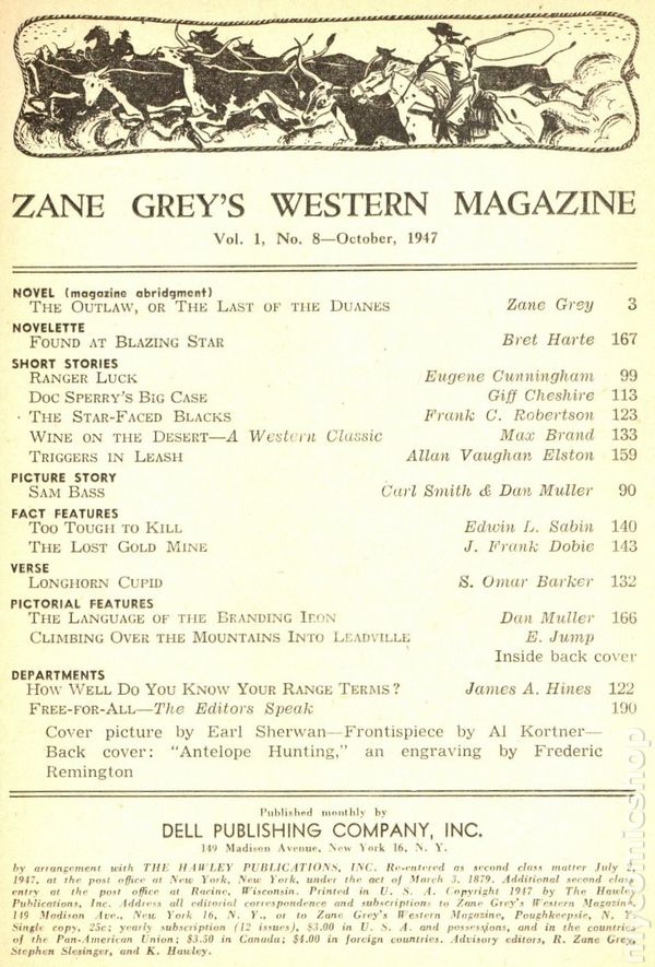 October 1947 Volume CCXVII, Number 6. Novels include: "Long-River Legacy" by L.L. Foreman and "The T Down Ramrod" by Walt Coburn. Novelettes include: "Six-guns Round the Bend" by Giff Cheshire, "Bullet Purge" by James Shaffer, and "The Noose Hangs High" by Rod Patterson. Short Stories and Features include: "Name your Brands" by Jack Luzzatto, "Mustang King" by John Richard Young, "Boothill Epidemic" by Ralph Yergen, "How to tell a Dude" by Nat McKelvey, "Range Savvy" by Gene King, "Mountain Goats" by Jim West, "Where to go" by John North, "Guns and Gunners" by Captain Philip B. Sharpe, "Mines and Minging" by John A. Thompson and "Bullets are for Buttheads" by Steve Hail. A crossword puzzle on page 144. Cover by H.W. Scott. Cover price $0.25.