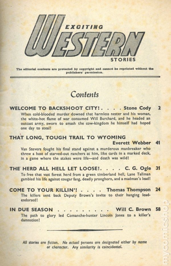 Cover art by Bud Thompson. The Wreckers, script by Bill Woolfolk, art by Kurt Schaffenberger; Captain Marvel, Jr. vs. Hammerhead. The Hidden Fear starring Nyoka the Jungle Girl, art by Bernie Krigstein. Bloobstutter's Bangtail Bonanza text story by Rod Reed. Uncle Jeeves' Arrival starring Colonel Corn and Korny Kobb, art by George Storm. The Dangerous Escape, art by Bill Ward and Charles Tomsey; While visiting the state prison, Jim and Susan learn of the escape of two desperate criminals, so Bulletman and Bulletgirl head into action to round them up. The Lost Case starring Richard Richard, Private Dick, script and art by Dick McKay. The Lucky Mistake, art by Irvin Steinberg; Two men kill the trapper Moose Bailey and steal his furs, and Hopalong goes after them in the snow. 52 Pages, Full Color. Cover price $0.10.