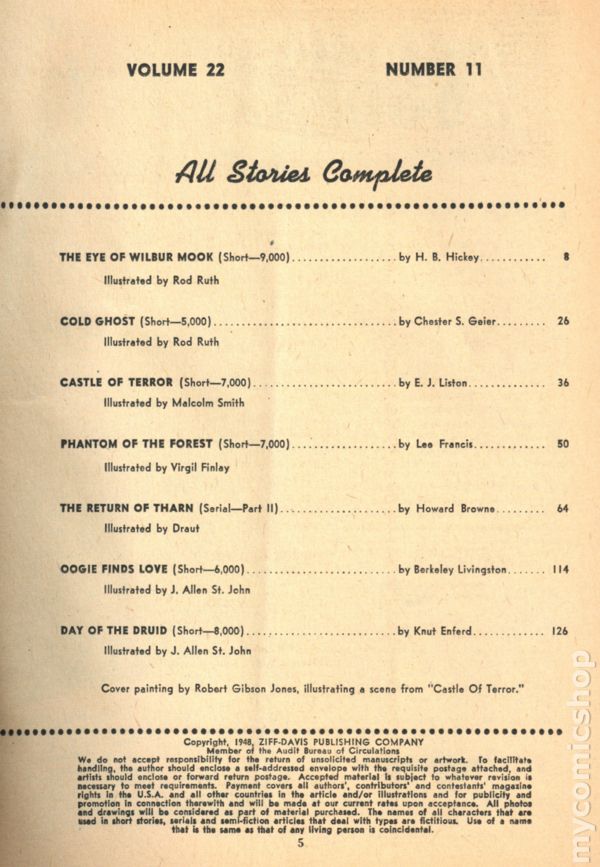 Volume 22, Issue 11 - November, 1948. Cover by Robert Gibson Jones. Science fiction stories by H.B. Hickey, Chester S. Greier, E.J. Liston, Lee francis, Howard Browne, Berkeley Livingston, and Knut Enferd. Illustrations by J. Allen St. John (2 stories), Virgil Finlay, Rod Ruth, Malcolm Smith, and Draut. 7" x 10"; black and white with color cover; 154 newsprint pages. Cover price $0.25.