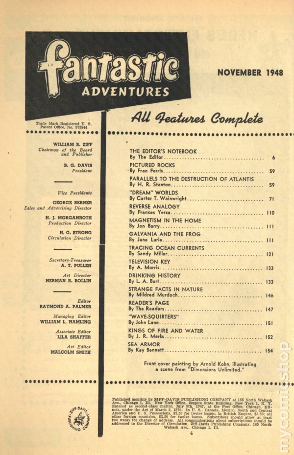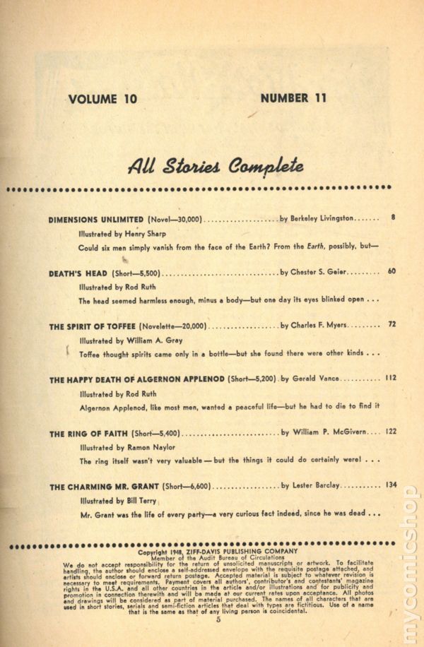 Volume 10, Issue 11 - November, 1948. Cover by Arnold Kohn. Science Fiction and Adventures stories. This issue features "Dimensions Unlimited" by Berkeley Livingston. Softcover Pulp, 7-in x 10-in, 156 Pages, B&W. Cover price $0.25.