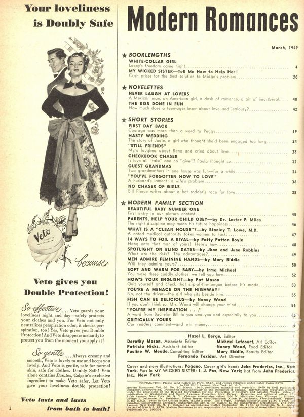 Art by Vernon Henkel and Warren Broderick. Fox Feature Syndicate presents the third romance title to launch the romance comics craze, following Crestwood's "Young Romance" and Timely/Marvel's "My Romance". A reporter bends the facts to help his actress girlfriend's career, and loses his job over it; Linda wants to steal her sister Beth's man through trickery, and when that doesn't work, she tries to do Beth in; Nell tries to lure lawyer Sam away from her polio-stricken sister Wilma, then causes an auto wreck. Plus love advice to readers. I Broke Her Heart and Laughed About it; Kill for Love; Facts You Wouldn't Believe; May I Tell You About Anne?; I Was a Love Thief. 32 pages, Full Color. Cover price $0.10.