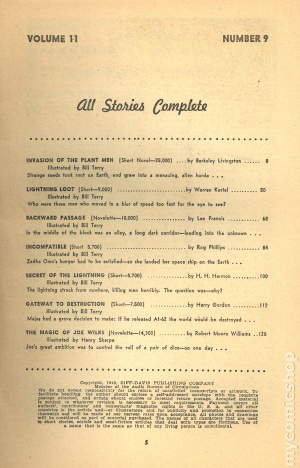 Volume 11, Issue 9 - September, 1949. Cover by Robert Gibson Jones. Science Fiction and Adventures stories. This issue features "Invasion of the Plant Men" by Berkeley Livingston. Softcover Pulp, 7-in x 10-in, 162 Pages, B&W. Cover price $0.25.