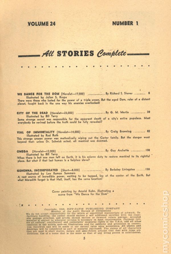 Volume 24, Issue 1 - January, 1950. Cover by Arnold Kohn. Science fiction stories by Richard S. Shaver "We Dance for the Dom!", C.M. Martin, Craig Browning, Guy Archette, and Berkeley Livingston. Illustrations by Leo Ramon Summers, Rod Ruth, Julian S. Krupa, and Bill Terry. 7-in. x 10-in.; black and white; 164 newsprint pages. Cover price $0.25.