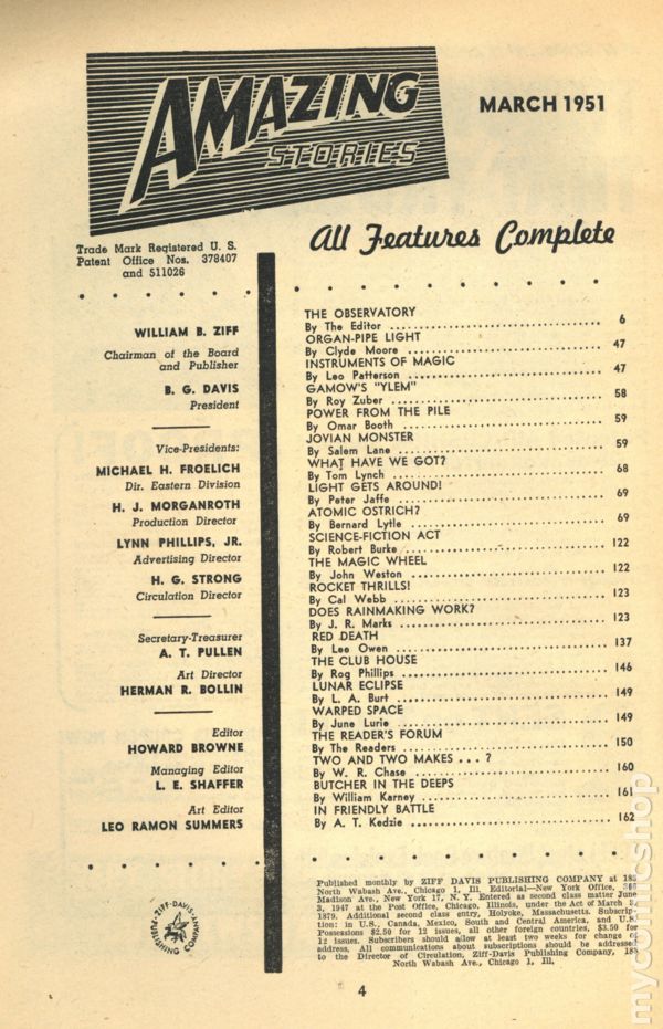 March 1951. Volume 47, Issue 1. Cover by Paul Orban. Science fiction stories by James H. Schmitz, E. B. Cole, Henderson Starke, Morton Klass, Andrew McDuff, Alan E. Nourse, H. B. Fyfe, and Jack Williamson. Article "Notes on Nuclear Radiation'" by Edwin N. Kaufman. Illustrations by Cartier, Orban, and Welker. Softcover, 5 1/2-in. x 7 1/2-in., 162 pages, Text (with B&W Illustrations). Cover price $0.25.