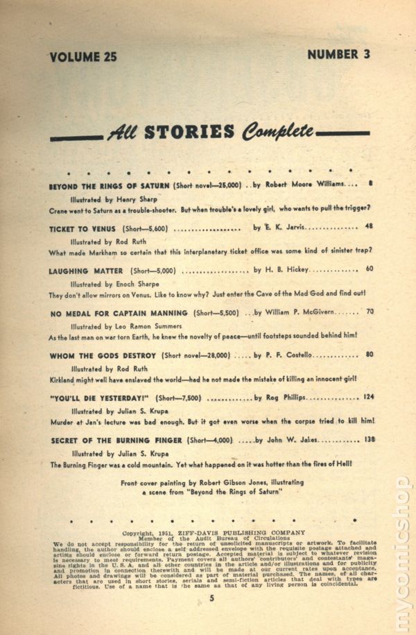 Volume 25, Issue 3 - March, 1951. Cover by Robert Gibson Jones. Science fiction stories by John Jakes, Robert Moore Williams, E.K. Jarvis, William P. McGivern, P.F. Costello, Rog Phillips, and H.B. Hickey. Illustrations by Leo Ramon Summers, Enoch Sharp, Rod Ruth, Henry Sharp, and Julian S. Krupa. 7-in. x 10-in.; black and white; 166 newsprint pages. Cover price $0.25.