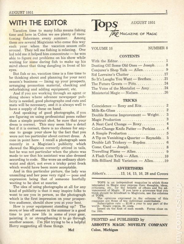 Tops (1936-1957 Abbott Magic & Novelty Co.) Vol. 16 #8Published 1951 (est.) by Abbott Magic & Novelty Co..