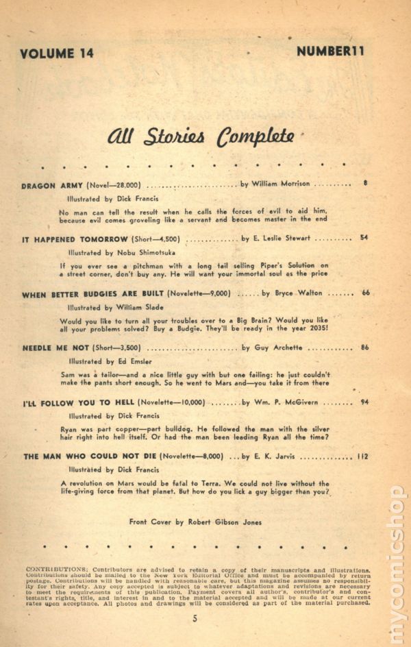 Volume 14, Issue 11 - November 1952. Cover by Robert Gibson Jones. Science Fiction and Adventures stories. This issue features "Needle Me Not" by Guy Archette, and "The Dragon Army" by William Morrison. Softcover Pulp, 7-in x 10-in, 132 Pages, B&W. Cover price $0.25.