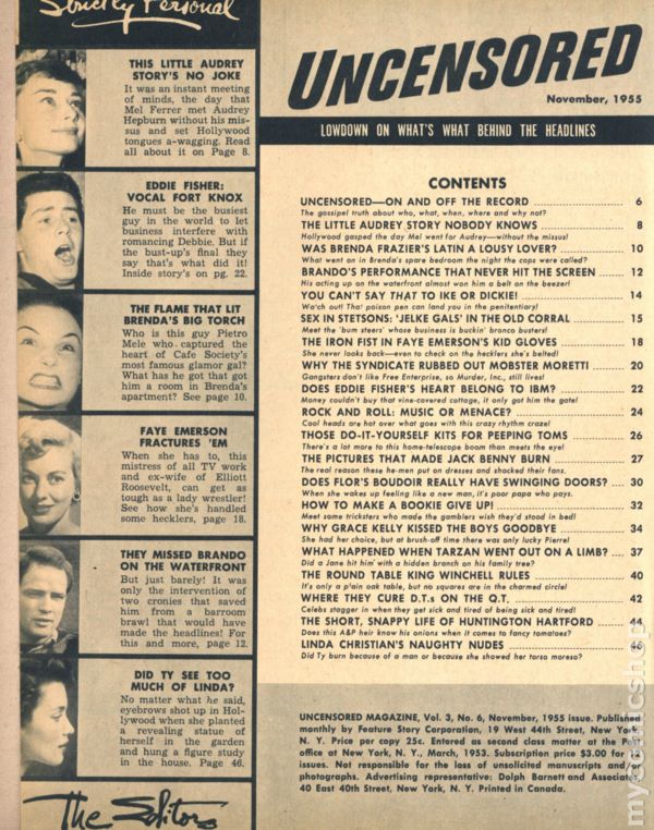 Volume 9, Number 5 - November, 1955. Gossip magazine promising The Stories Behind The Headlines. 8.5" x 11", 68 pages. B&W. Cover price $0.25.