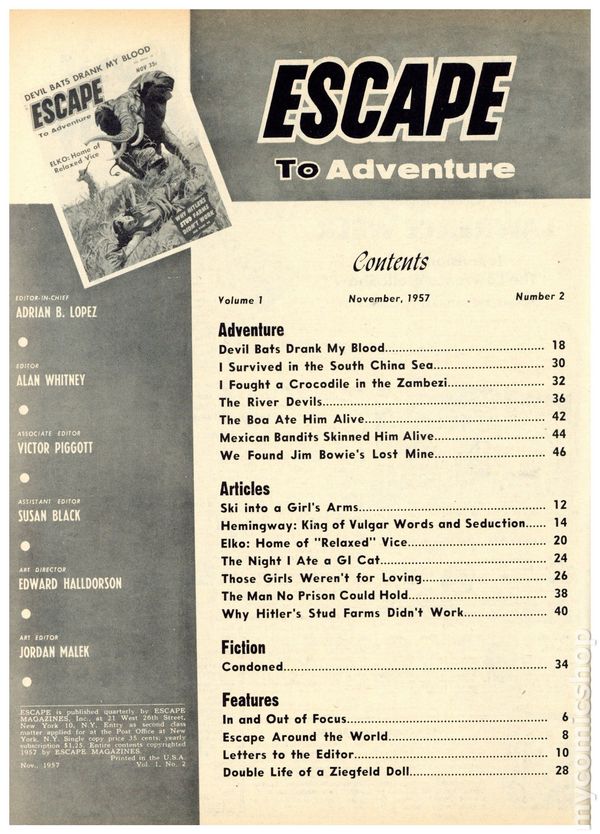 Volume 1 Issue 2 - November, 1957. Men's adventure magazines focusing adventures stories and pictorials. This issue features "Devil Bats Drank my Blood!", "Elko Home of Relaxed Vice" and "Why Hitler's Stud Farms Didn't Work!" 8 1/4-in. x 11-in., 84 pages, B&W Cover price $0.35.