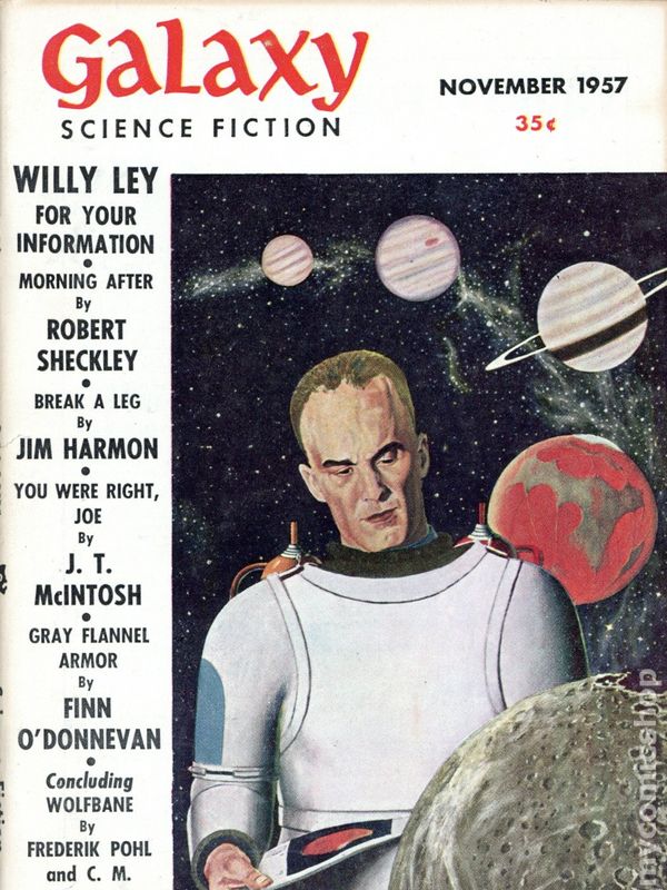 November 1957. Cover by Pederson. Stories: "Morning After" by Robert Sheckley, "Break a Leg" by Jim Harmon, "You Were Right, Joe" by J. T. McIntosh, "Gray Flannel Armor" by Finn O'Donnevan, and "Wolfbane"(Conclusion) by Frederik Pohl and C. M. Kornbluth. 5.25-in. x 7.5-in.; 144 Pages, B&W. Cover price $0.35.