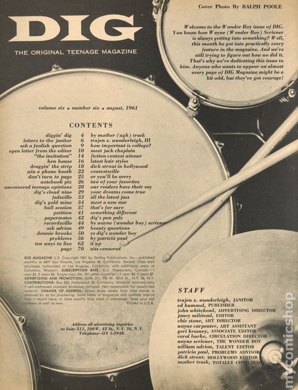Vol. 6, No. 6 - August 1961. Magazine for teenagers circa 1960's. Features articles and editorials on the times big names. 68 Pages, B&W/C. Cover price $0.25.