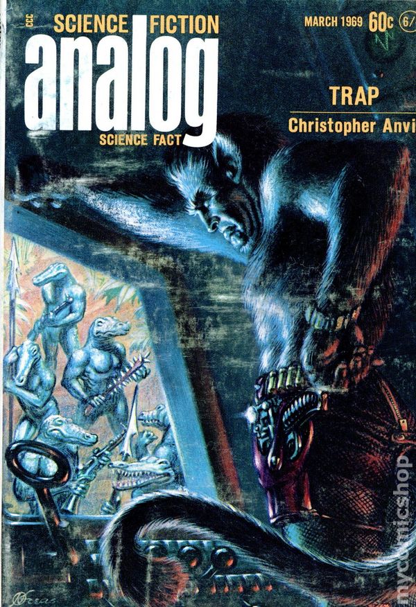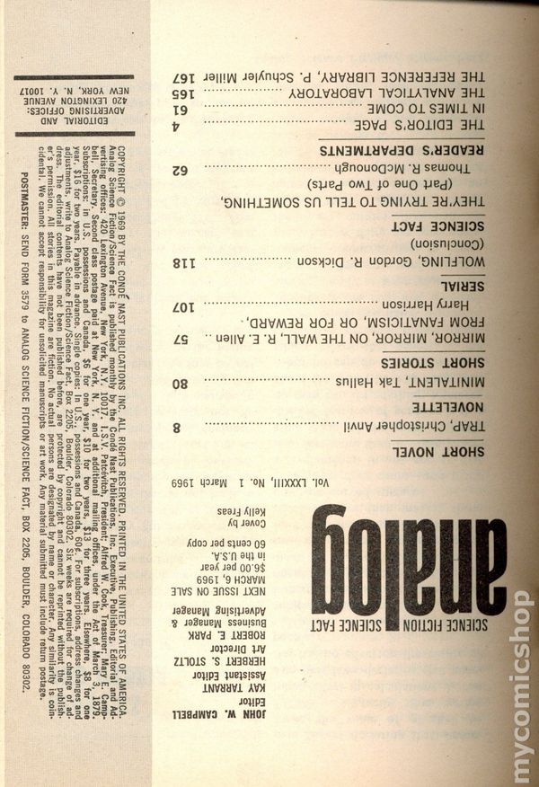 March 1969. Stories: "Wolfling" (conclusion) by Gordon R. Dickson, "Trap" by Christopher Anvil, "Minitalent" by Tak Hallus, "Mirror, Mirror, On the Wall" by R.E. Allen, and "From Fanaticism, or for Reward" by Harry Harrison. Science Fact feature, "They're Trying to Tell Us Something" (part 1) by Thomas R. McDonough. Cover by Kelly Freas. Illustrations by Kelly Freas and Leo Summers. Softcover, 5.5-in. x 7.5-in.; 178 newsprint pages, B&W. Cover price $0.60.