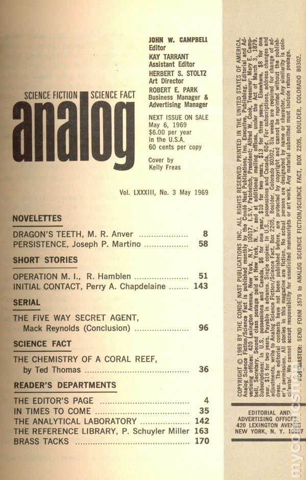 May 1969. Stories: "The Five Way Secret Agent" (conclusion) by Mack Reynolds, "Dragon's Teeth" by M.R. Anver, "Persistence" by Joseph P. Martino, "Operation M'I'" by R. Hamblen, and "Initial Contact" by Perry A. Chapdelaine. Science Fact feature, "The Chemistry of a Coral Reef" by Ted Thomas. Cover by Kelly Freas. Illustrations by Kelly Freas and Leo Summers. Softcover, 5.5-in. x 7.5-in.; 178 newsprint pages, B&W. Cover price $0.60.