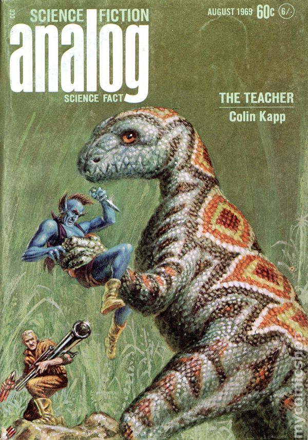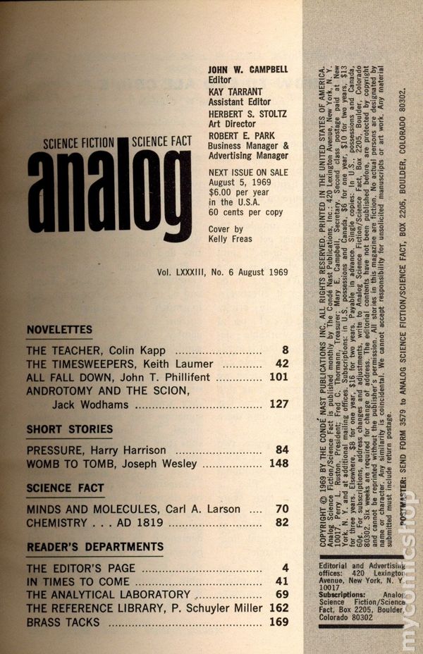 August 1969. Stories: "The Teacher" by Colin Kapp, "The Timesweepers" by Keith Laumer, "All Fall Down" by John T. Phillifent, "Androtomy and the Scion" by Jack Wodhams, "Pressure" by Harry Harrison, and Womb to Tomb" by Joseph Wesley. Science Fact article, "Minds and Molecules" by Carl A. Larson. Cover by Kelly Freas. Illustrations by N. Blakely, Vincent diFate, Peter Skirka and Leo Summers. Softcover, 5.5-in. x 7.5-in.; 178 newsprint pages, B&W. Cover price $0.60.