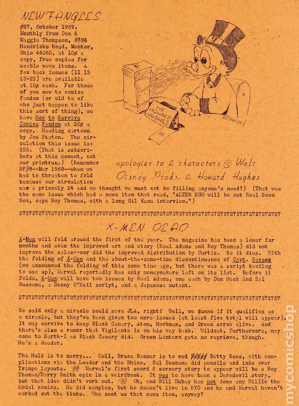 News zine published by Don and Maggie Thompson. This issue includes the folding of X-Men due to poor sales, the wedding of the Hulk's alter ego, Bruce Banner, to Betty Ross, rummage sale list, and more. 10 pages. Circulation 255. Cover price $0.10.