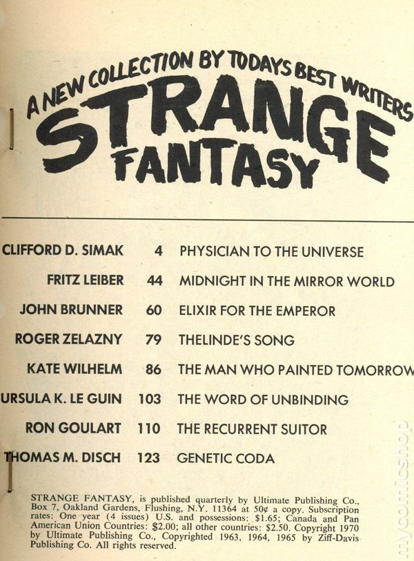 Issue #1 - Summer 1970. First issue; unnumbered and undated except for the title Science Fantasy Yearbook - 1970 on the cover, and 1970 Science Fantasy Yearbook on the spine. The indicia was simply Science Fantasy., 132 pages, black and white. Cover price $0.50.